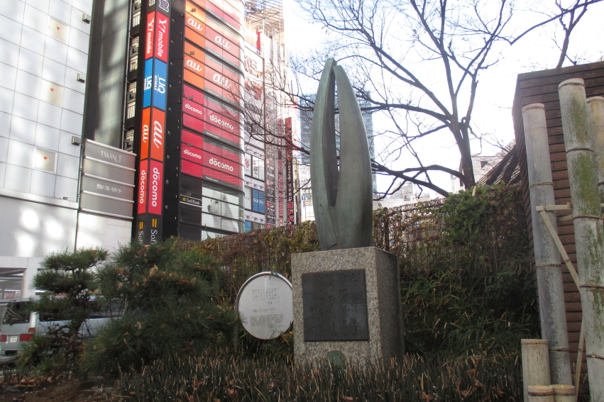 西条八十詩碑は新宿駅東口広場の人通りの多い場所に置かれています。しかし、誰も見る人は居なくて、ここで写真を撮っていると物珍しそうに見て、みんな通り過ぎていきます。確かに、今の若者に西条八十!と言ってもだれも知らないかもしれませんから致し方ないですが、ちょっと寂しさを感じさせられました。