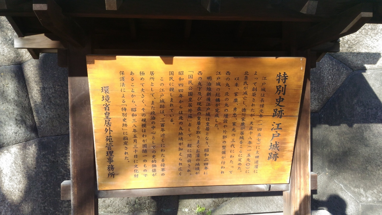 いまは大半が皇居内となっている江戸城ですが、昔は広かったそうで、皇居まわりの一般地域にも石垣や門跡が残っていて、史跡として登録されています。こちらは皇居近くにあるもので、その歴史(北条氏から徳川氏所有)の説明書きとともに石垣を見ることができました。