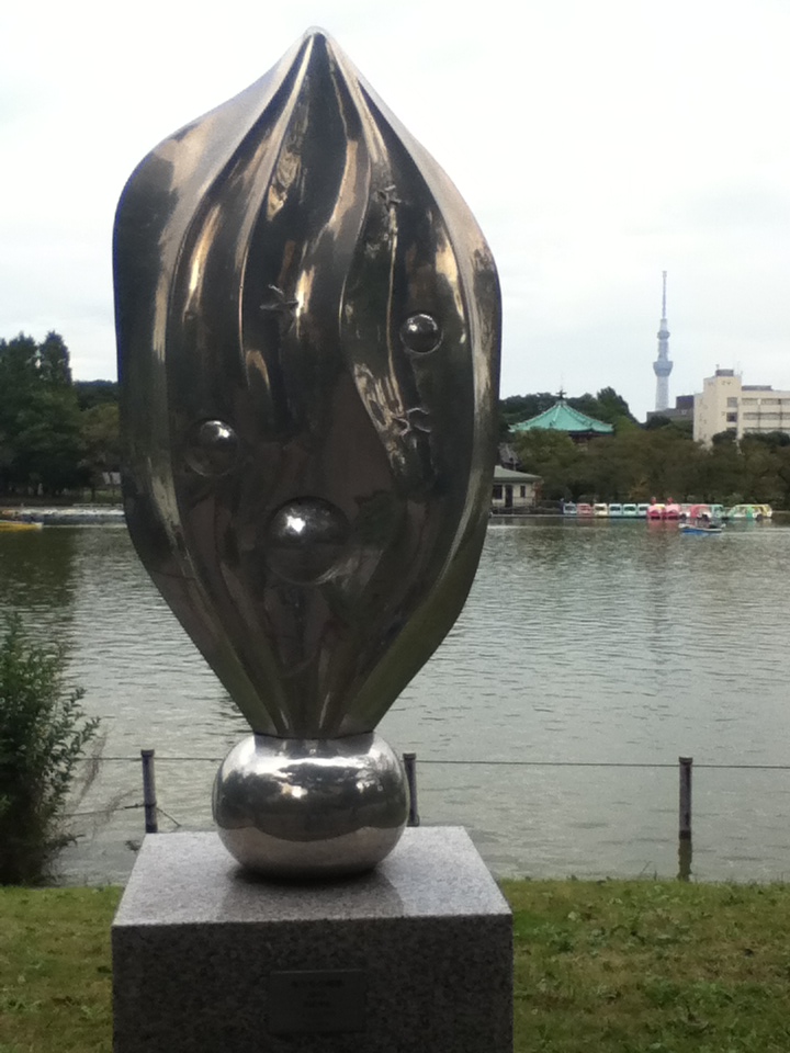 不忍池の西岸沿いで横山大観記念館の向かいに立っている。多くの人が前を歩いていくが、このオブジェを見る人は他にいなかった。お勧めの点は、オブジェは鳥籠のようなユニークな形状で面白いこと、金属製で光り輝き遠くからでも目立つこと、オブジェの先には弁天堂や上野公園など素敵な景色が見えること、不忍池や弁天堂などと併せて訪問するのもいいかもしれないこと、駅から徒歩で行けることである。