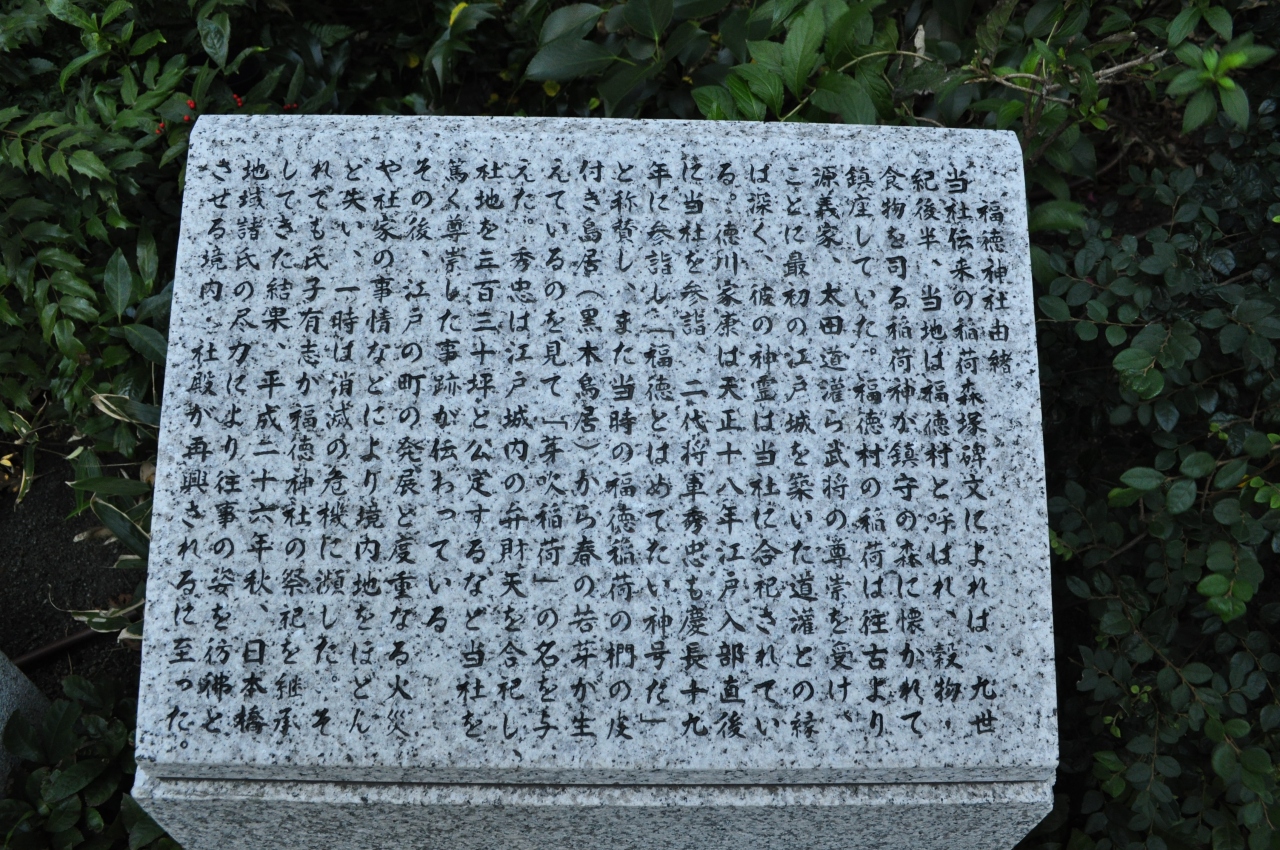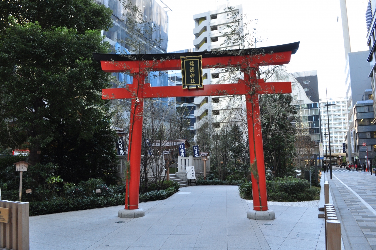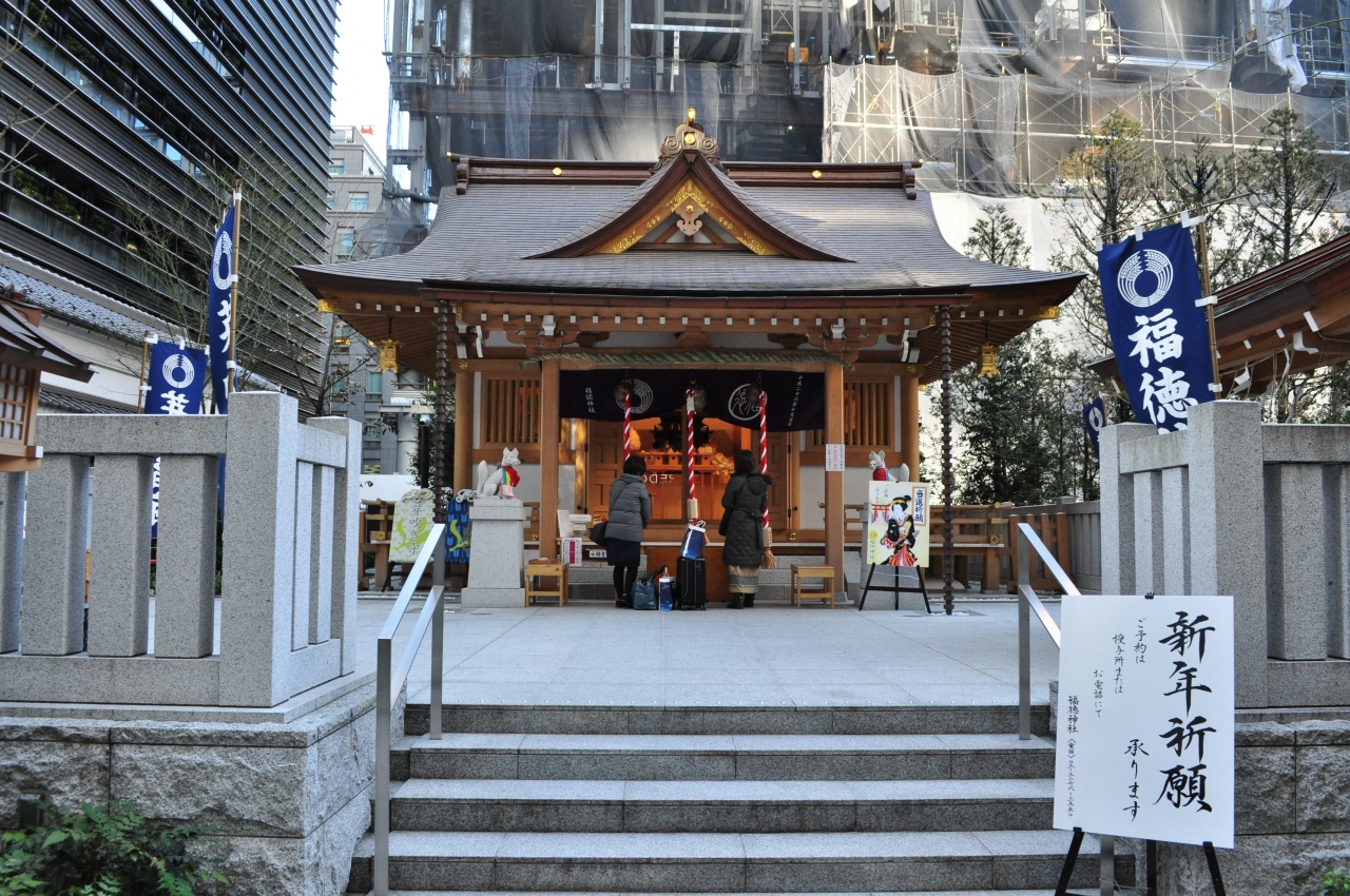 日本橋の中心街、コレド室町のすぐ裏手にありました。商業施設に囲まれた地区の一角が福徳神社です。御由緒が書かれてた石碑によりますと、福徳神社は9世紀後半には既に創建されていたとの事です。つい最近新しく修繕されたのか、全てが新しくとても綺麗な神社でした。高層ビルに囲まれた不思議な感じのする神社ですが、ちらほらと参拝される人がいて、人が途絶えることはなかったです。境内に入ると都会の喧騒を忘れてしまいそうなくらい、落ち着いた雰囲気のある神社でした。