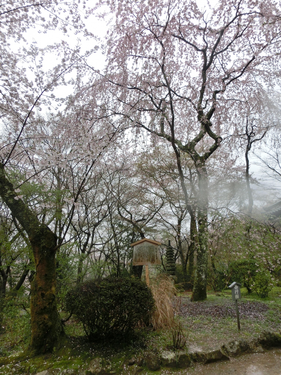 桜の季節の雨の日の午後、観光タクシーで京都の西郊外の桜で有名な3寺を家内と一緒に参拝しました。善峯寺、十輪寺の後、最後に参拝したのは勝持寺です。十輪寺からは程近い場所にあります。タクシーを降りると立派な桜の木々、花々が目の前でしたが、それは「勝持寺」ではなく、国宝「如意輪観音」のある願徳寺の桜でした。勝持寺は「花の寺」の別名を持ちますが、桜は盛りを過ぎていました。平清盛の時代、佐藤義清が出家し西行と名を改めた寺としても名高く、本降りの雨の中ぬかるむ境内を進み、西行桜を見学しました。晴天に咲き誇る桜ではなく雨に打たる桜の方が若くして官位を捨て仏道に入り精進した西行の人生を象徴しているようだと妙に感心しました。雨だからこそ残る思い出もあるものです。阿弥陀堂の拝観入口から入り右に進むと瑠璃光殿があります。薬師如来、日光菩薩、月光菩薩、十二神将等が安置されており一見の価値はあります。
