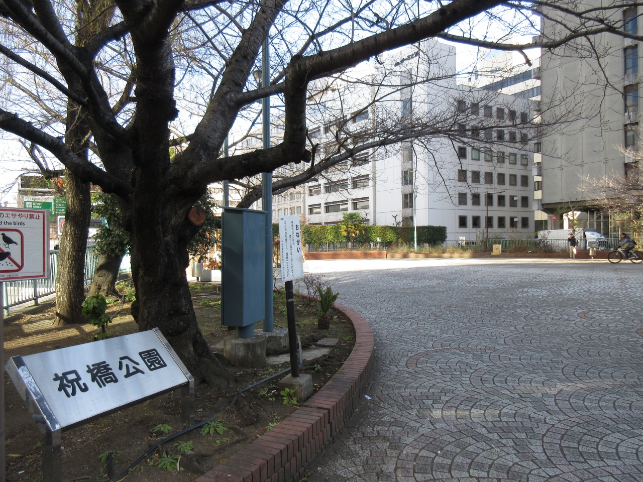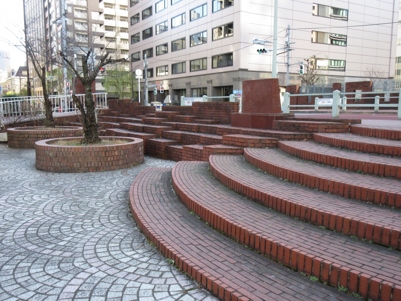 首都高速道路の上に架かる祝橋に隣接した、赤茶色のレンガを使って造られた公園です。祝橋の欄干も同じレンガで建築物をイメージしていて祝橋公園と一体化しています。公園の階段や花壇と木の囲いもレンガを使い、煉瓦銀座を思わせ、粋な公園です。大木の桜や柳が植えられています。先日銀座1丁目を散策して知った、明治時代に銀座に煉瓦造りの建物が建てられたことや柳が植えられたことを実際に見せる公園です。銀座2丁目から4丁目にかけて首都高速道路の上に公園が3つありますが、一番気に入った公園です。