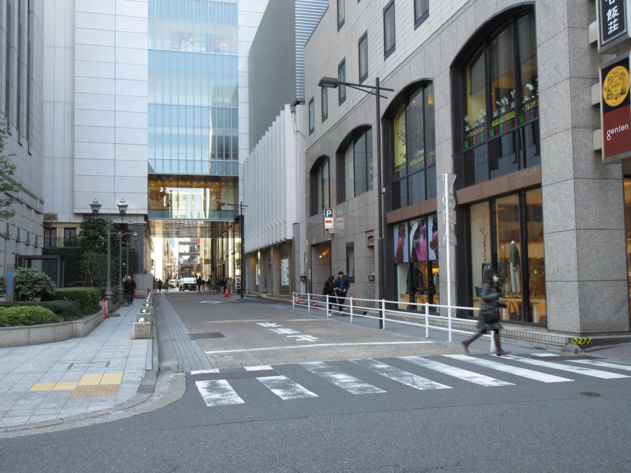 松屋銀座の裏の通りです。通りにはホテルや家具店などが建っています。有名ブランド店の駐車場やデパート駐車場があるため、あづま通りに各店舗の駐車場案内係の人たちがボードを持って立っていました。表通りというより裏通りの感じで、休日午前は車の出入り以外、人通りは銀座にしては多くなかったです。意外に静かな通りでした。