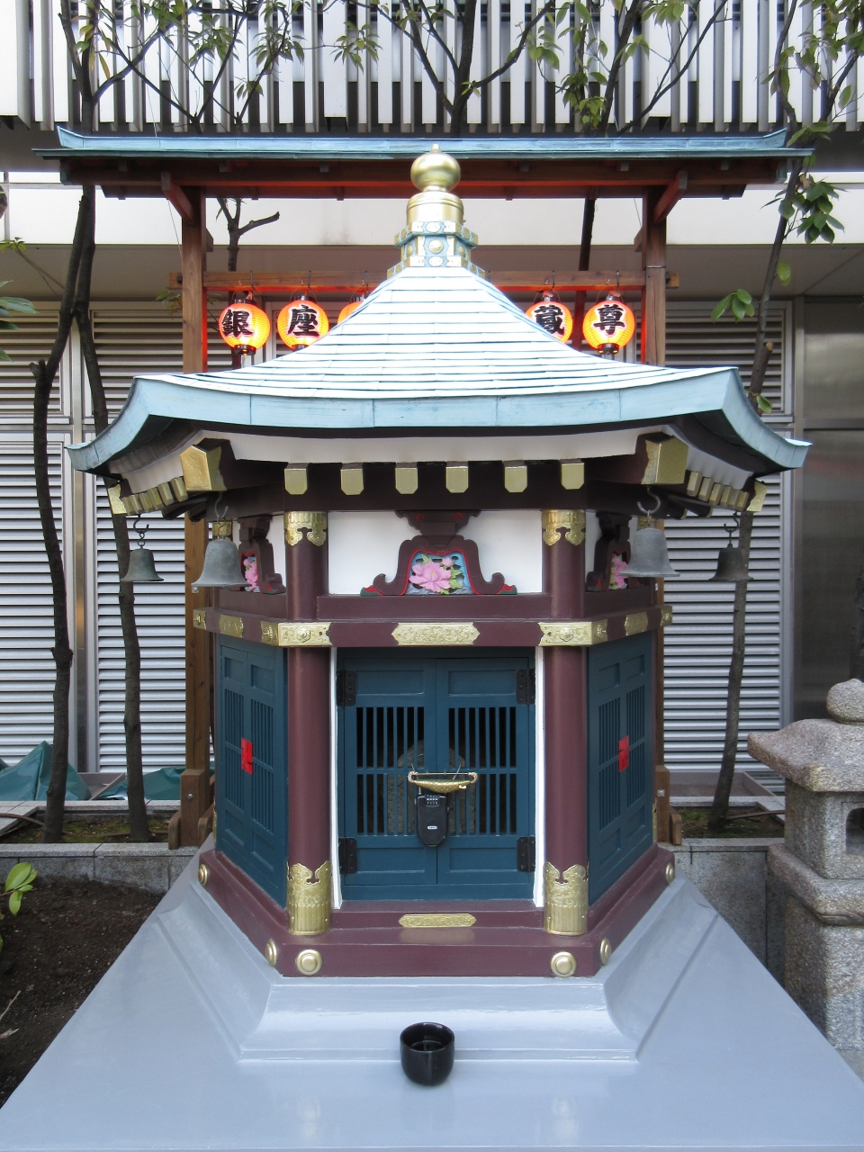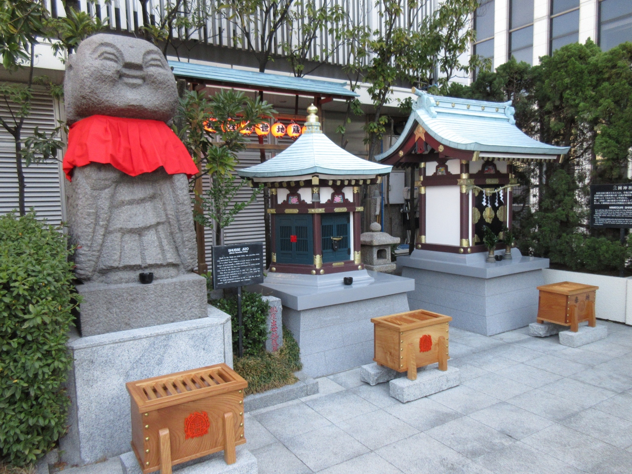 銀座駅直結の銀座三越店の9階にあります。テーブルやベンチのある銀座テラスの一画に大きくユーモラスな地蔵尊が立ち、その右に銀座出世地蔵尊が祀られているお堂があります。明治初期に三十間堀から出てきた地蔵尊を祀り、開運・出世・延命・商売繁盛を祈願していました。銀座三越を新築した際に、屋上に移し銀座八丁の守り本尊として祀られました。奉讃会会員名簿の碑があり、多くの人に信じられていることが分かります。かわいらしいお堂の中に祀られています。近寄ると小さな地蔵尊が見えます。大きい地蔵が目立ちますが、隣のお堂内の地蔵尊をじっくり見ることをおすすめします。
