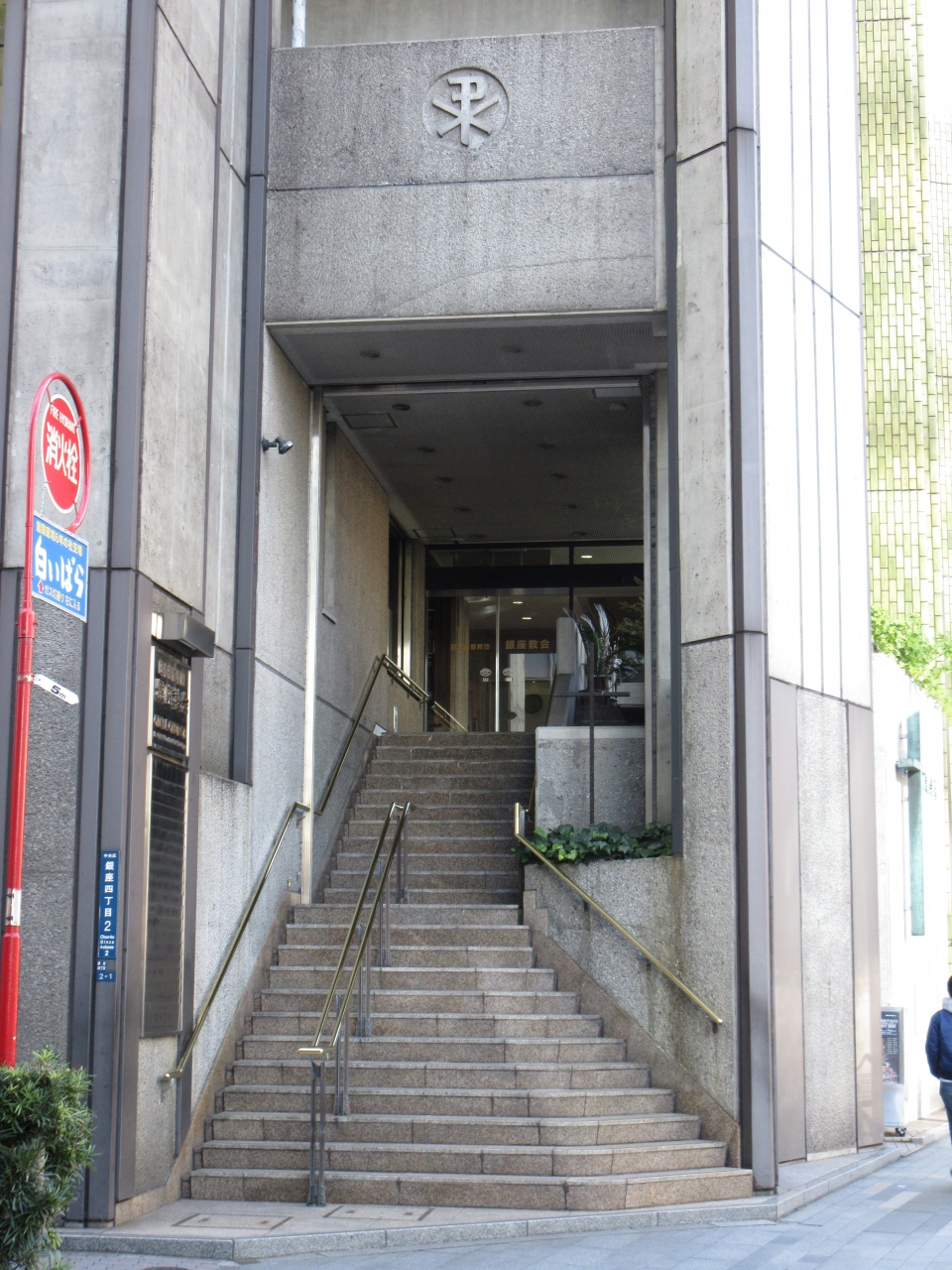 銀座駅からすぐの、外堀通りと銀座松屋通りの角に建つ教会です。松屋通りに面した1階はギャラリーになっていて、絵が飾られていて、教会はどこかと思ってしまいました。角に面して階段が続き、会堂の入口がありました。この辺りの外堀通りを何回か歩いていますが、ここに教会があると気付きませんでした。1890年からこの地で活動しています。特徴の一つに正午礼拝があり誰でも参列することができます。銀座に密着した教会であることが分かります。