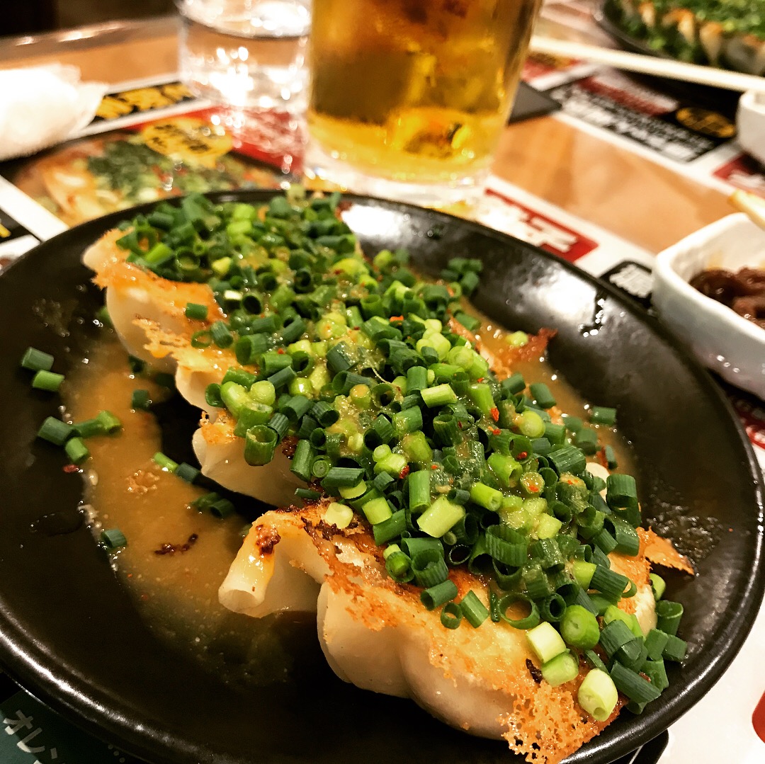 ここの名物は味噌ダレとネギがかかった餃子です。