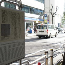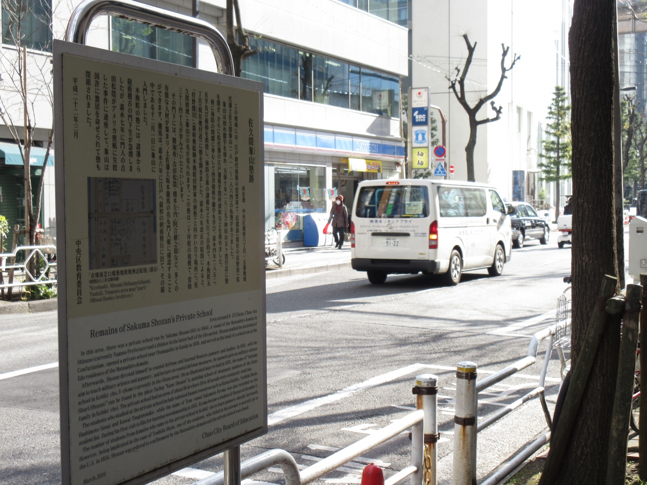 みゆき通り沿い、東銀座5丁目交差点から10mほどの歩道に説明板が立っています。江戸末期に活躍した長野県松代出身の思想家で、西洋砲術や蘭学を学び、説明板が立っている近くに塾を開きました。門下生には明治時代に活躍した勝海舟や吉田松陰、坂本龍馬などがいたそうです。松代にも象山を祀った神社がありますが、多くの人に影響を与え、未だに崇拝されている立派な人物であったに違いありません。