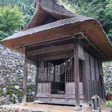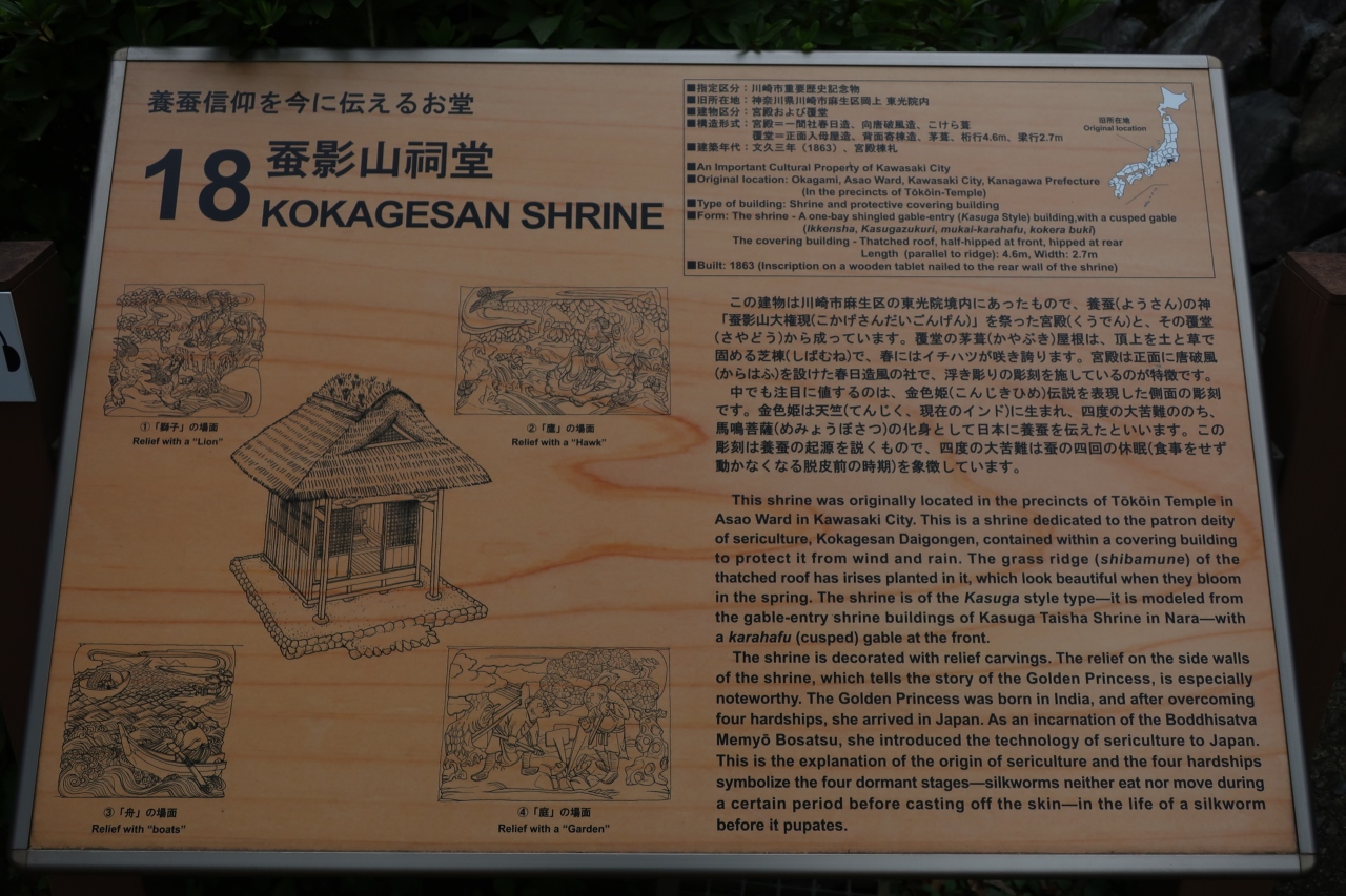 川崎市立古民家園にある養蚕の神を祀る祠堂です。古民家園の中では小さい建物で、もとは川崎麻生の東光院境内にあった物です。外に見える建物は覆堂で、その中に「蚕影大権現」を祀る宮殿があるので、ちゃんと中を見学してください。そうすると、宮殿に施され金色姫の物語を表わした見事な浮彫を見ることができます。古民家園の他の建物にこの様な彫刻はありません。
