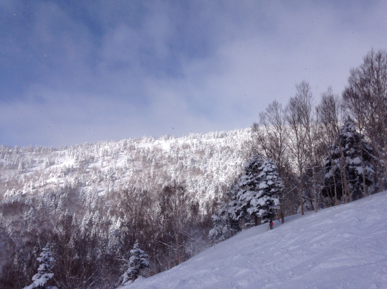 朝までに50cmぐらい降ったようで、焼額山スキー場のいくつかのコースでは腰パウダーまでになった。とても柔らかく乾いた雪で、滑るとフワッを舞うように切れていく様は大興奮のスキーを味わえた。