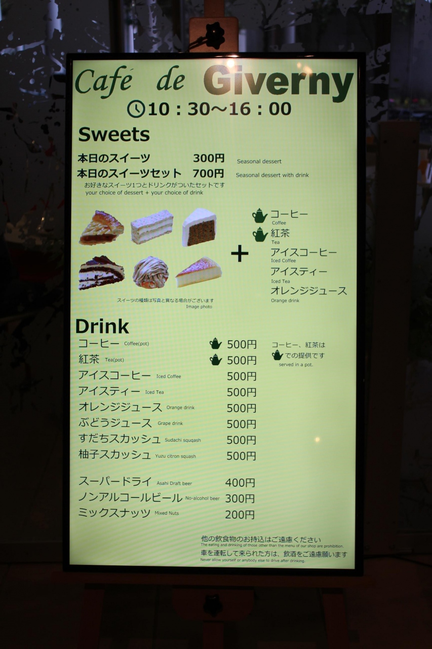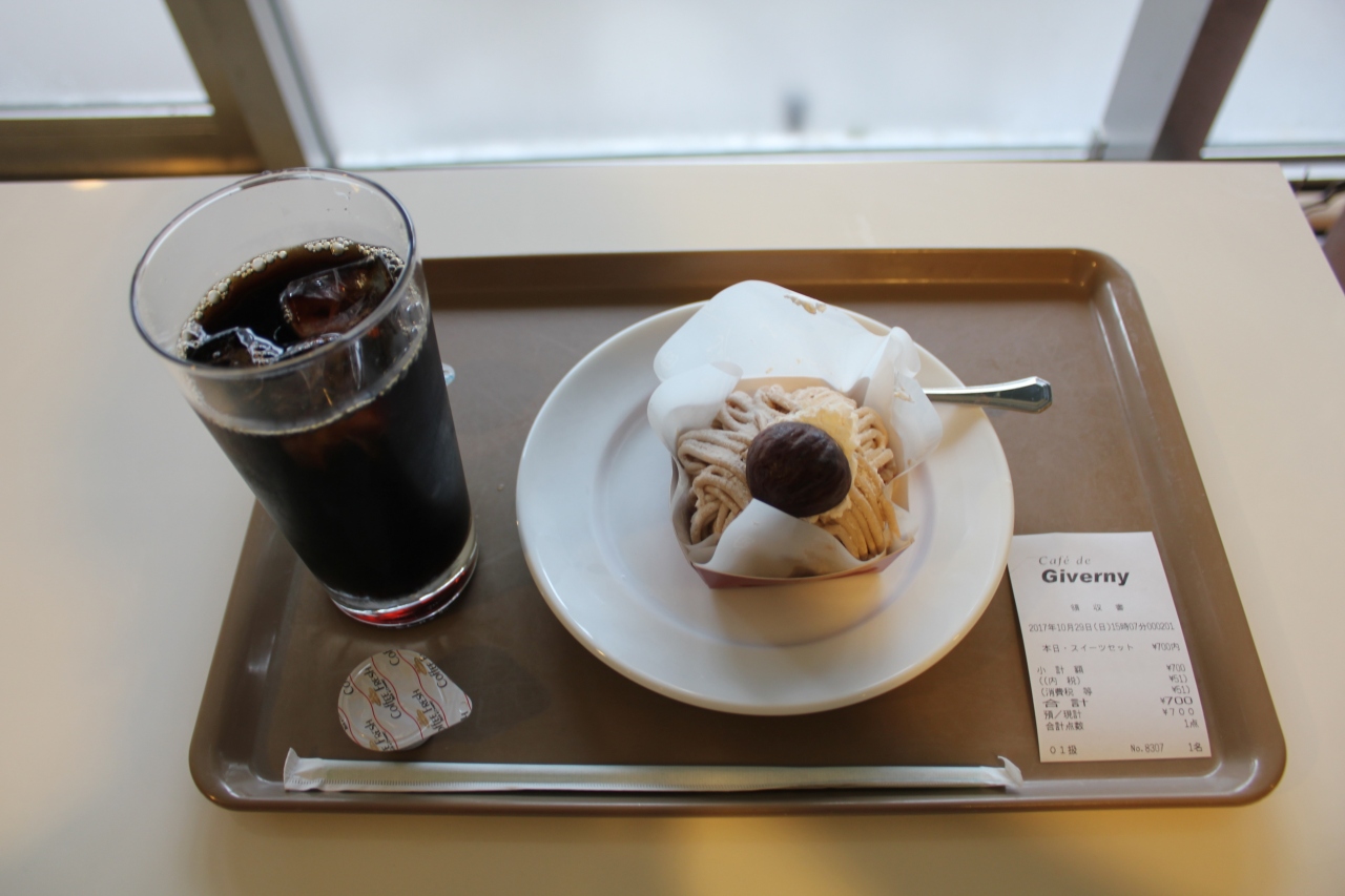 「ムンクのどら焼きセット」が気になりましたが、アイスコーヒーが飲みたかったのでスイーツセット(ケーキ類+ドリンクで700円)を注文、午後3時頃のためか店内は空いていて、モネの大睡蓮に面したカウンター席で景色を楽しみながら頂きました。