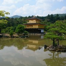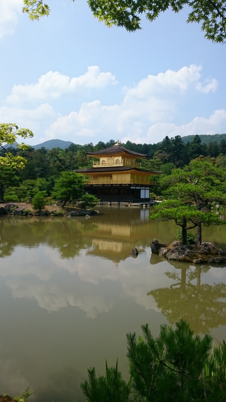 京都からオープンバスで市内を眺めながら行きました。京都と言えば金閣寺と誰もが連想する日本を代表するお寺です。美しい庭園の中、池に光り輝く建築物はいつ何度見ても飽きません。友達と2人で御朱印巡りをするのに御朱印帳を探していたら此処に水色に金閣寺が入ったステキな物を見つけて買いました。