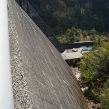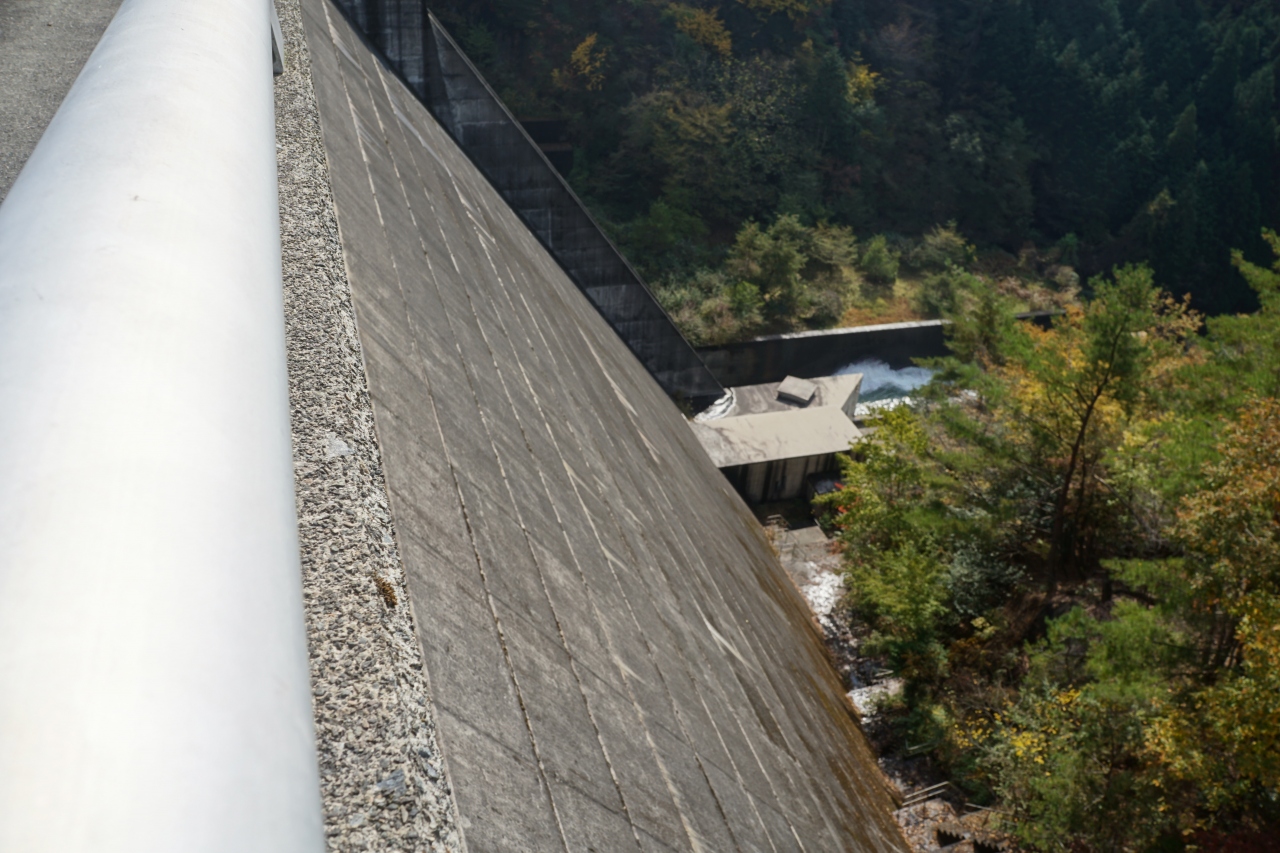 しばらく上って開けた場所に出たと思ったら、美しいダム湖が現れて、傍らの駐車場に車を止めました。ダムの上から下を見下ろしましたが、けっこうな高さ。ダムの迫力もなかなかです。
