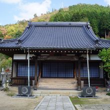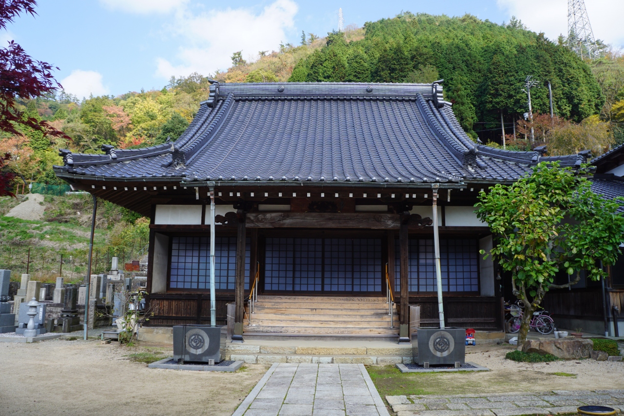 生野の市街には山沿いの一段高い場所にお寺がいくつも並んで建っています。本行寺もその一つ。日蓮宗の寺です。石段を上がって山門を入ると、山をバックにした本堂が建つ。本堂前には石塔と緑の濃い松が二つ。すっきりしたお寺です。