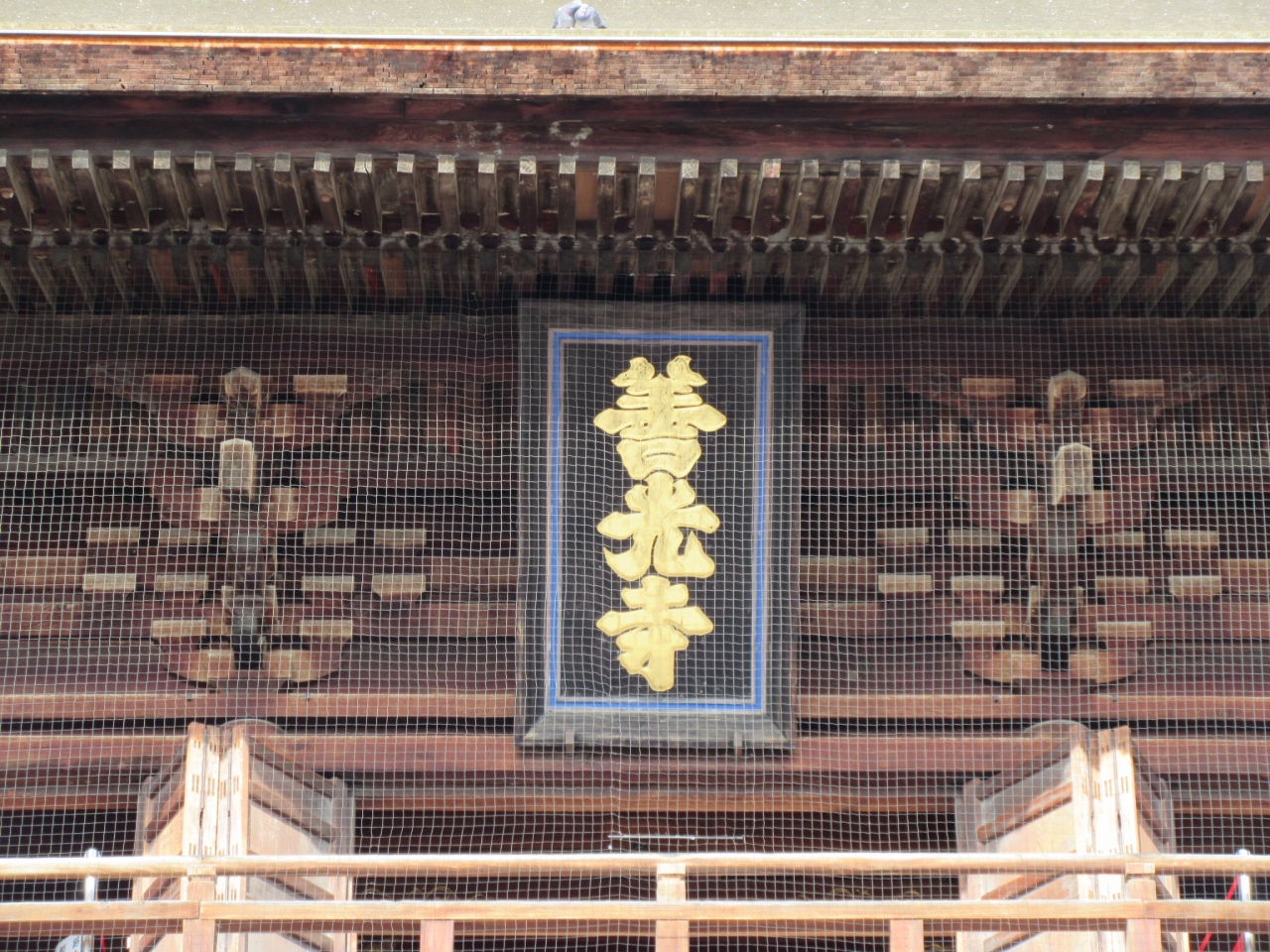 仁王門をくぐると次に見えてくるのが山門。善光寺といえばこの三門の楼上に掲げられている「善光寺」の文字。
