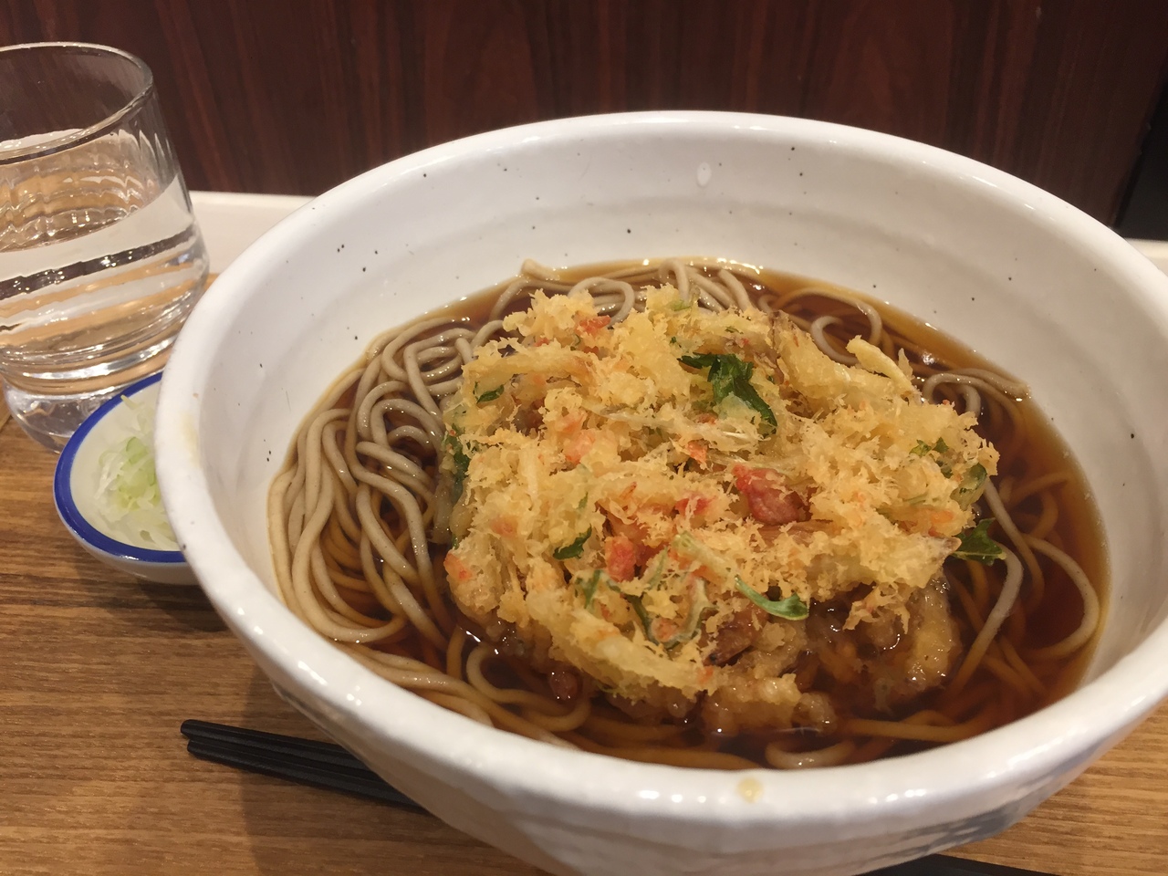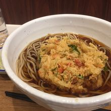 基本的に椅子があるので、立ち食いではありません。この日は、かき揚げ天そば440円を頼みました。店内が狭いので、歩くときに注意が必要です。