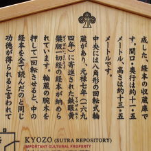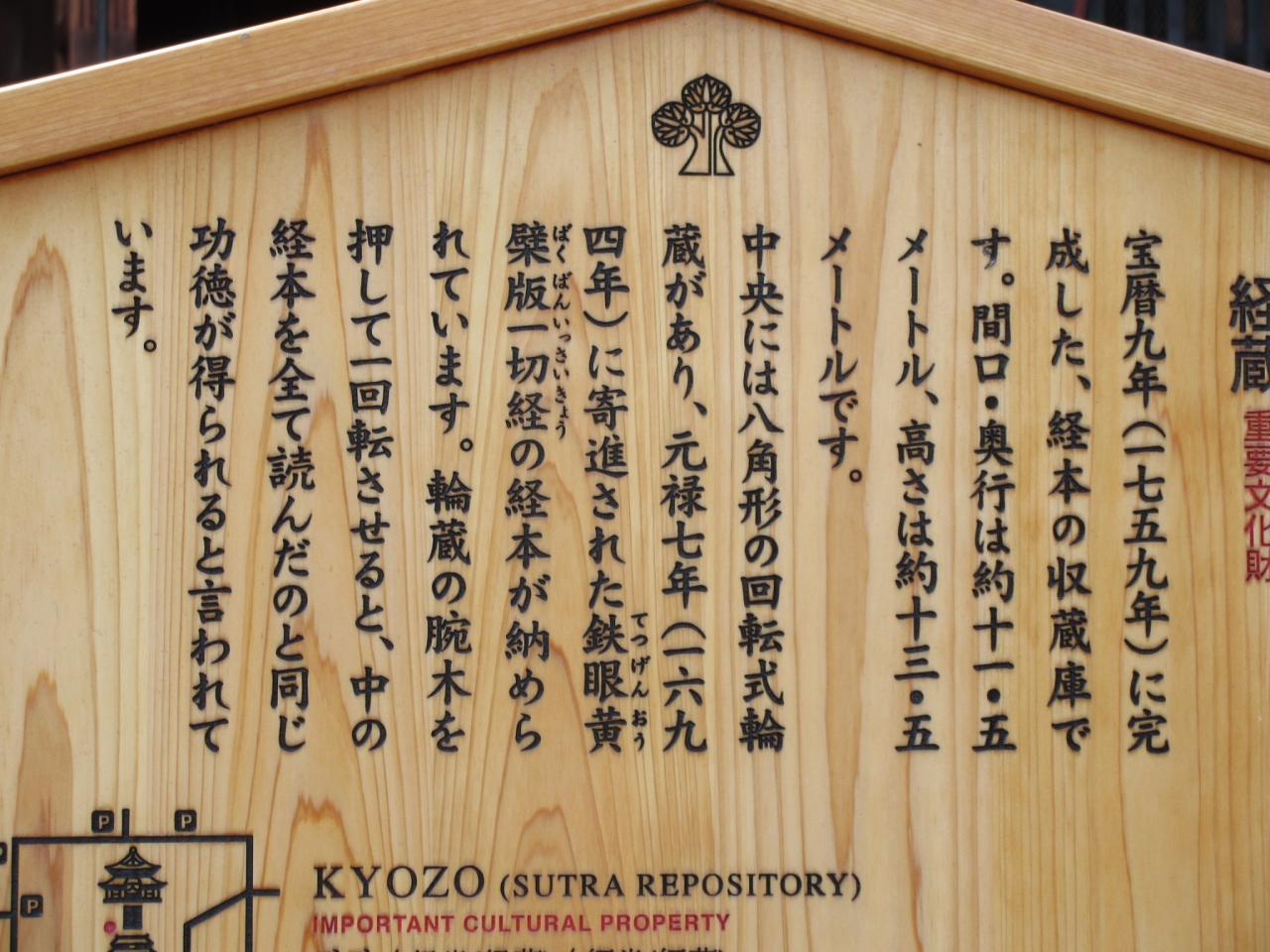 1759年に完成した経本の収蔵庫です。八角形の回転式輪蔵があり「一切経」の経本が収められています。輪蔵を回すことで、お経を総て読んだと同じ功徳が得られると言われています。ただ、回すには拝観券が必要です。