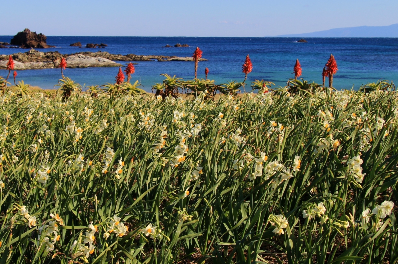 快晴のもと満開の水仙と伊豆諸島を見られて良かったです。ただ南伊豆で暖かいと思っていましたが、快晴でしたが風が強く少し寒かったです。