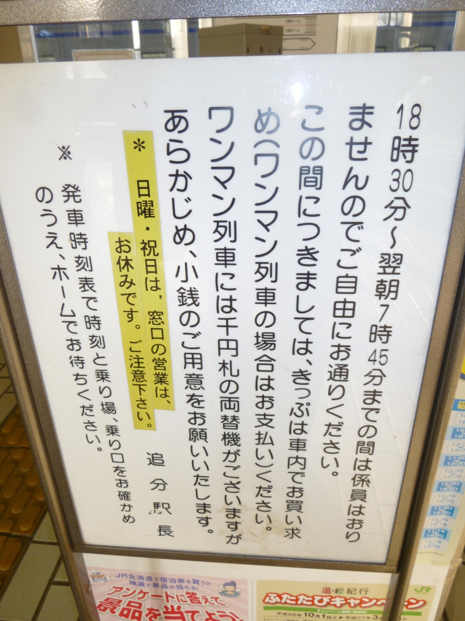 苫小牧駅では「列車到着まで待合室でお待ち下さい」のやさしい案内が・・・