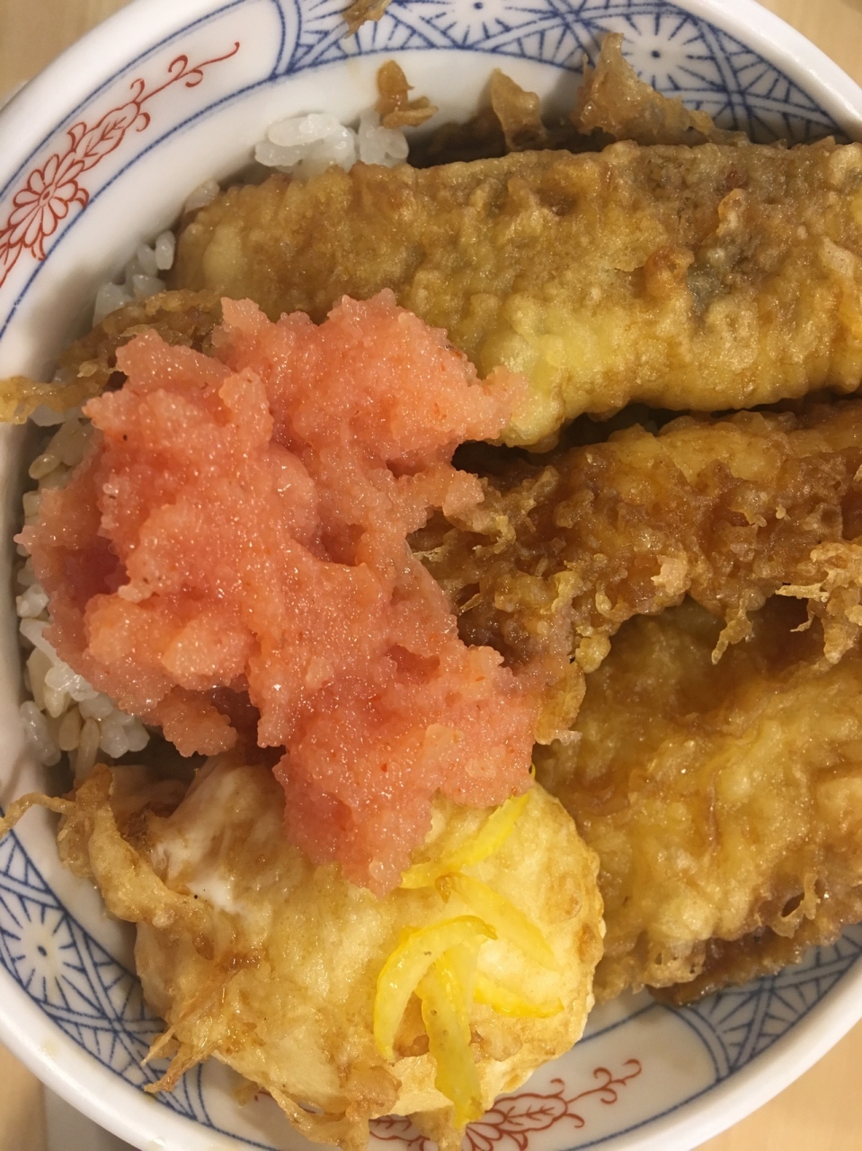 明太子食べ放題という看板に惹かれてお店へ。天丼をオーダー。揚げたてでタレもたっぷりかかっていて美味しかったです。