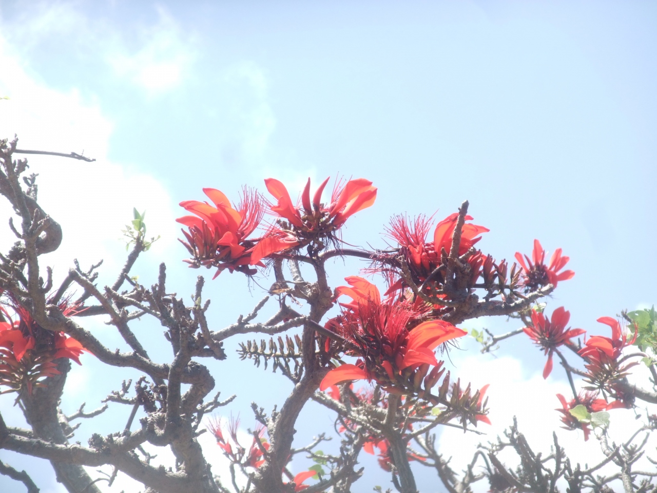 玉取崎展望台周辺には花も多く、色んな色のハイビスカスが咲いていましたが、大きな何本ものデイゴの樹に赤い花が咲いていたのも印象的で見ものでした。