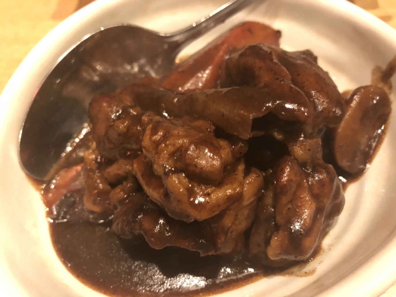 平日の18時半頃に初めて訪問しました。2人でテーブル席へ。まずはビールの中瓶を。サッポロの黒ラベルでした。やきとんはタン、レバ、ハラミ、他にはねぎま、おしんこ、ぶり刺身、キーマカレーオムレツ、チキンの赤ワイン煮を注文しました。どれも本当にいい味で、チキンの赤ワイン煮はお肉が柔らかくってシチューのようでした。この他に追加でビールの中瓶、日本酒を頼んで1人2500円程。こじんまりとして常連さんで賑わっていましたが、和む居酒屋さんでした。