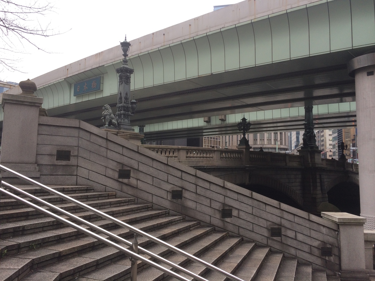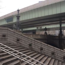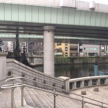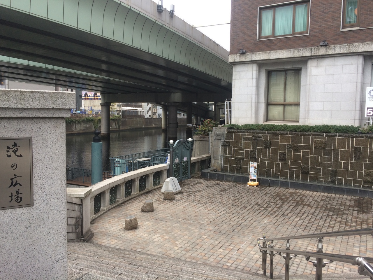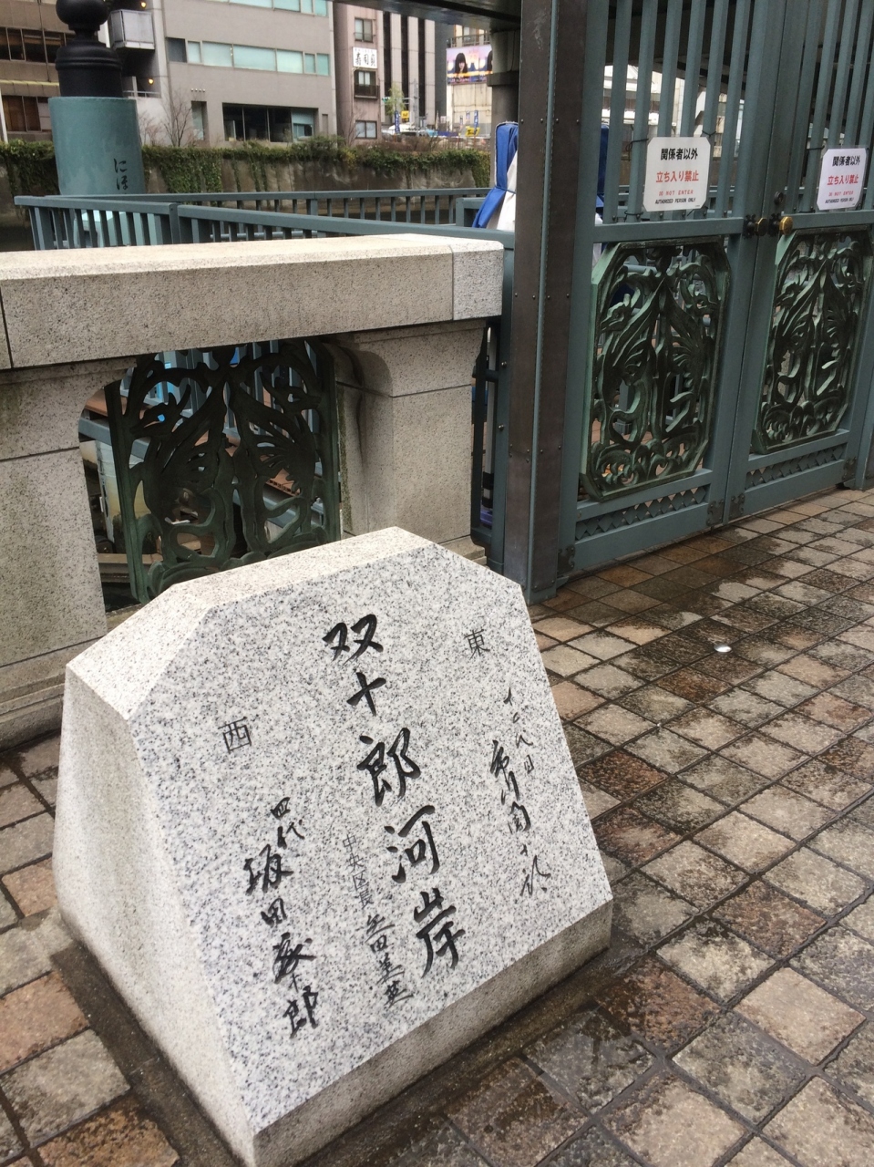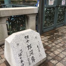 日本橋の橋の手前の少し下がった場所が小さな広場になっていて、綺麗な石碑が建っていました。小さな石碑で何のための石碑かはわかりませんでしたが、石碑の後ろは川になっています。船着場でもあるようで川と広場の境には門がありました。