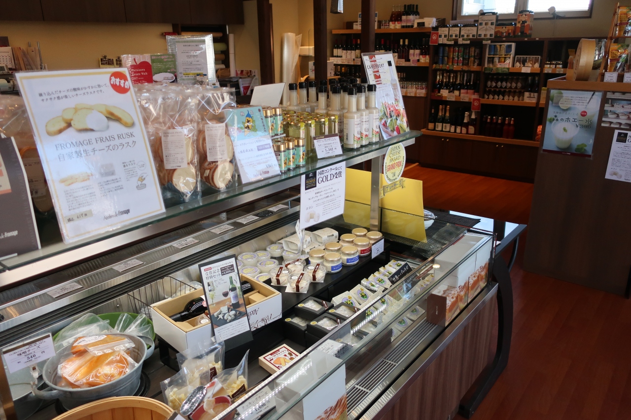 軽井沢駅の北口から中山道を越え500m程北に入った所にアトリエドフロマージュ軽井沢チーズ熟成所・売店があります。店内ではここで作られたチーズを始め、ワイン、ソフトクリームが売られており、2階では熟成中のチーズを見学することができます。