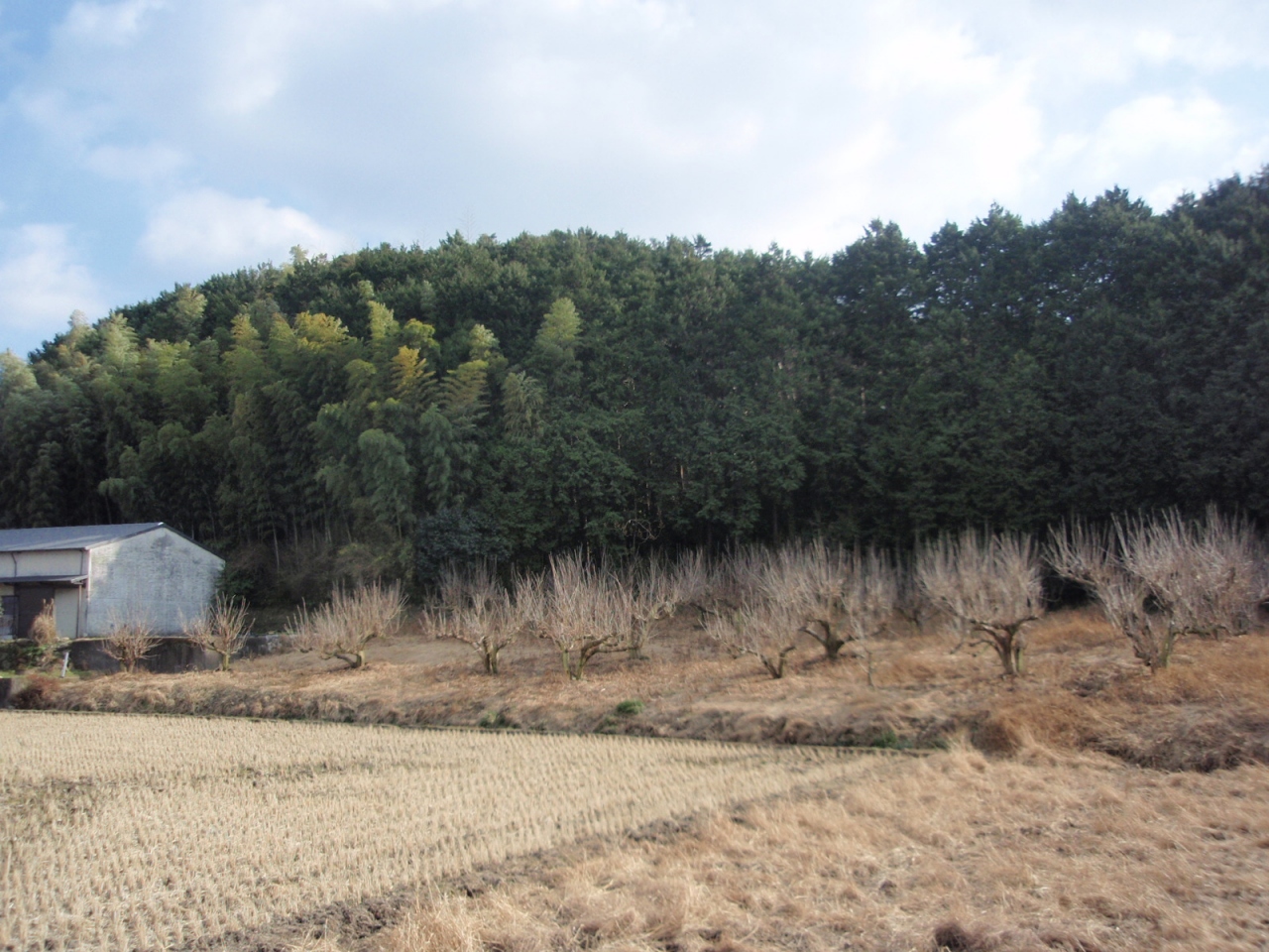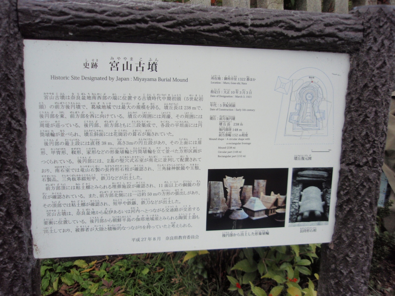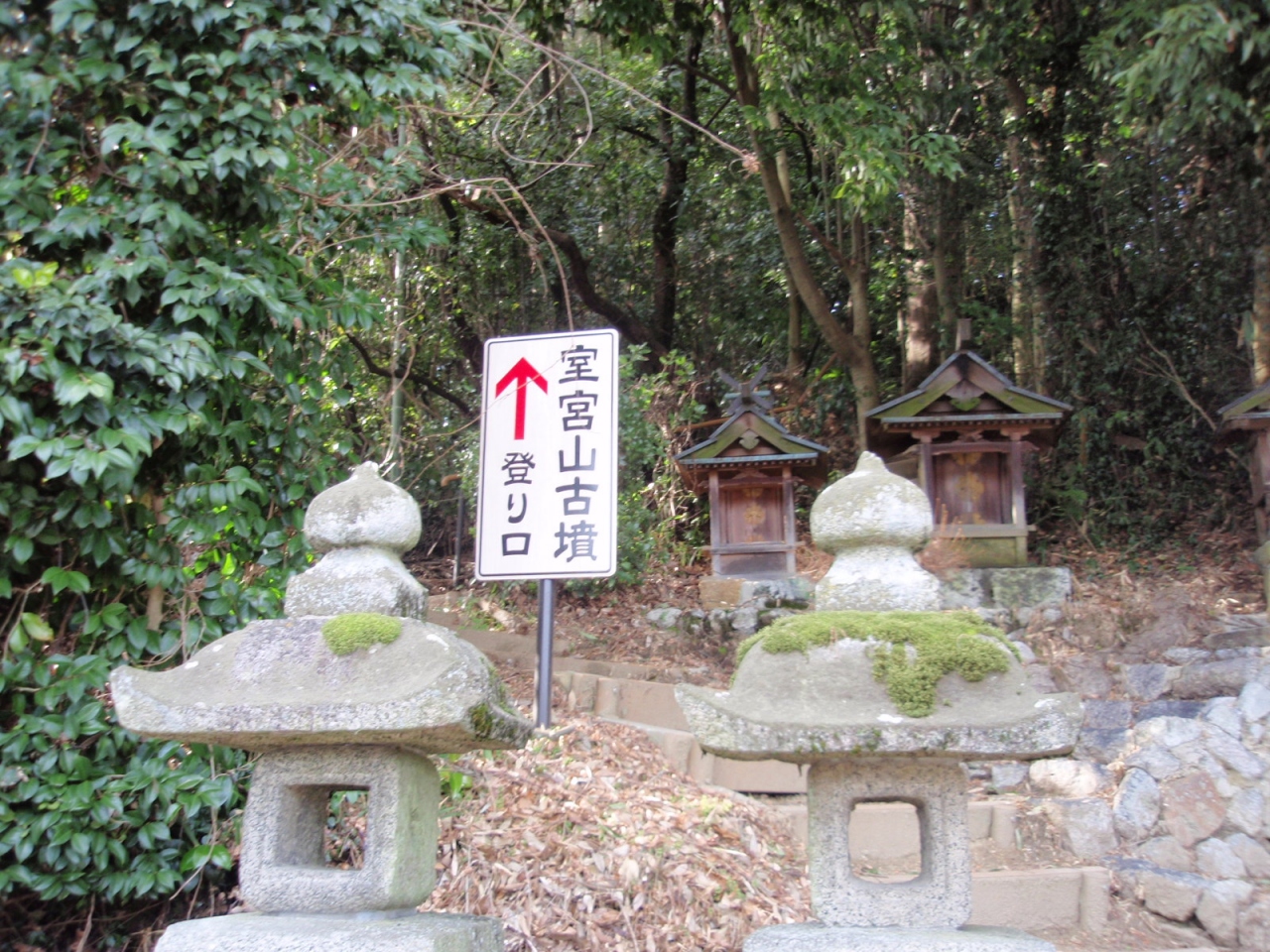 国見山登山の帰りに室宮山古墳に寄りました。長さ238Mの前方後円墳でかなり大きな古墳です。葛城地方では最大だそうです。築年代は五世紀前半で、被葬者は葛城襲津彦といわれています。鉄刀、埴輪、土器、鏡等が出土している。側面から見た場合かなり大きな古墳であることがうかがえますが、説明板がなければ古墳とは思えません。多くの古墳はこの様なものですね。八幡神社の境内に室宮山古墳石室に登る登山口がありました