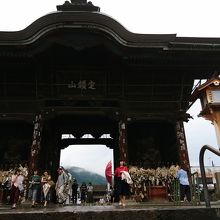 あこがれていた信濃善光寺参りの入り口、仁王門です。1752年に創建されましたが、1847年の善光寺地震で焼失。その後も、火災で焼失したりして、今の仁王門は1918年にできたものです。善光寺の仁王像は、通常の配置とは逆で左側に阿形像、右に吽形像があります。高さが、13、6メートルの立派な門で、仁王像の下には、たくさんのわらじがありました。みなさんのご利益のお礼なのでしょうね。いよいよここから善光寺の中へと入ります。