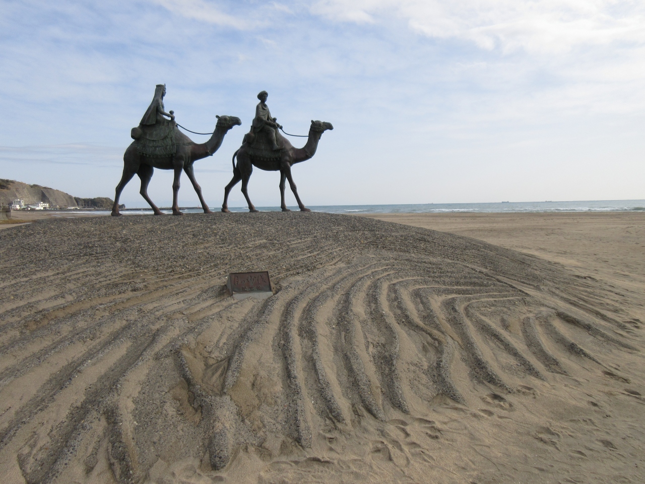 砂浜に二頭のラクダに乗った王子と王女の像が建つ海岸です。2kmほどにわたる白い砂浜には3つの海水浴場があります。夏には多くの人で賑わうようですが、真冬に訪れたため、サーファーがいるだけでした。日本、スペイン、メキシコの友好を記念する塔が立つ記念広場展望台からも、広々とした海岸の一部を眺めることができました。朝の散歩も人が少なく、海岸を独り占めしたようでとても気持ちが良かったです。
