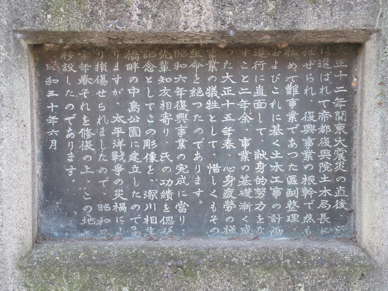 関東大震災復興事業に献身的努力をされ心身疲労の極、惜しくも生命を絶たれた方で、その功績を偲び記念としてこの彫像を建立したものの、太平洋戦争の災禍により損傷したので昭和三十年春修復の上、この地に移設した。