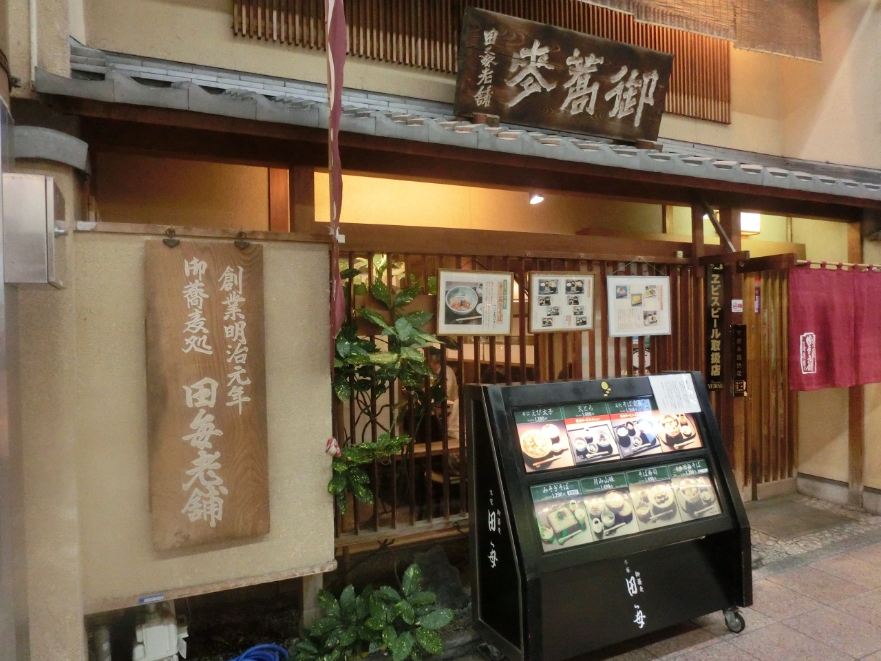 三条通のアーケード街にある明治元年創業の蕎麦の老舗です。老舗とはいっても入りやすい雰囲気で店頭に出ていた値段もお手頃だったので夕食で利用しました。奥が座敷で手前がテーブル席になっています。単品の他にセットもありメニューは豊富です。穴子丼定食にしました。穴子丼プラスさつま揚げの入ったおそばのセットで出汁は当然京風で薄味、穴子丼共々、適量で美味しかったです。最後に貰った蕎麦湯のとろっとし風味がさすが老舗という感じでした。テーブル席は一人のお客さんが多く、一人旅にもぴったりのお店でした。蕎麦焼酎の水割りを含め1,980円、サービスもてきぱきとしており、満足の夕食でした。