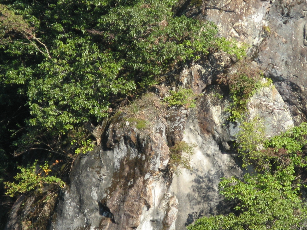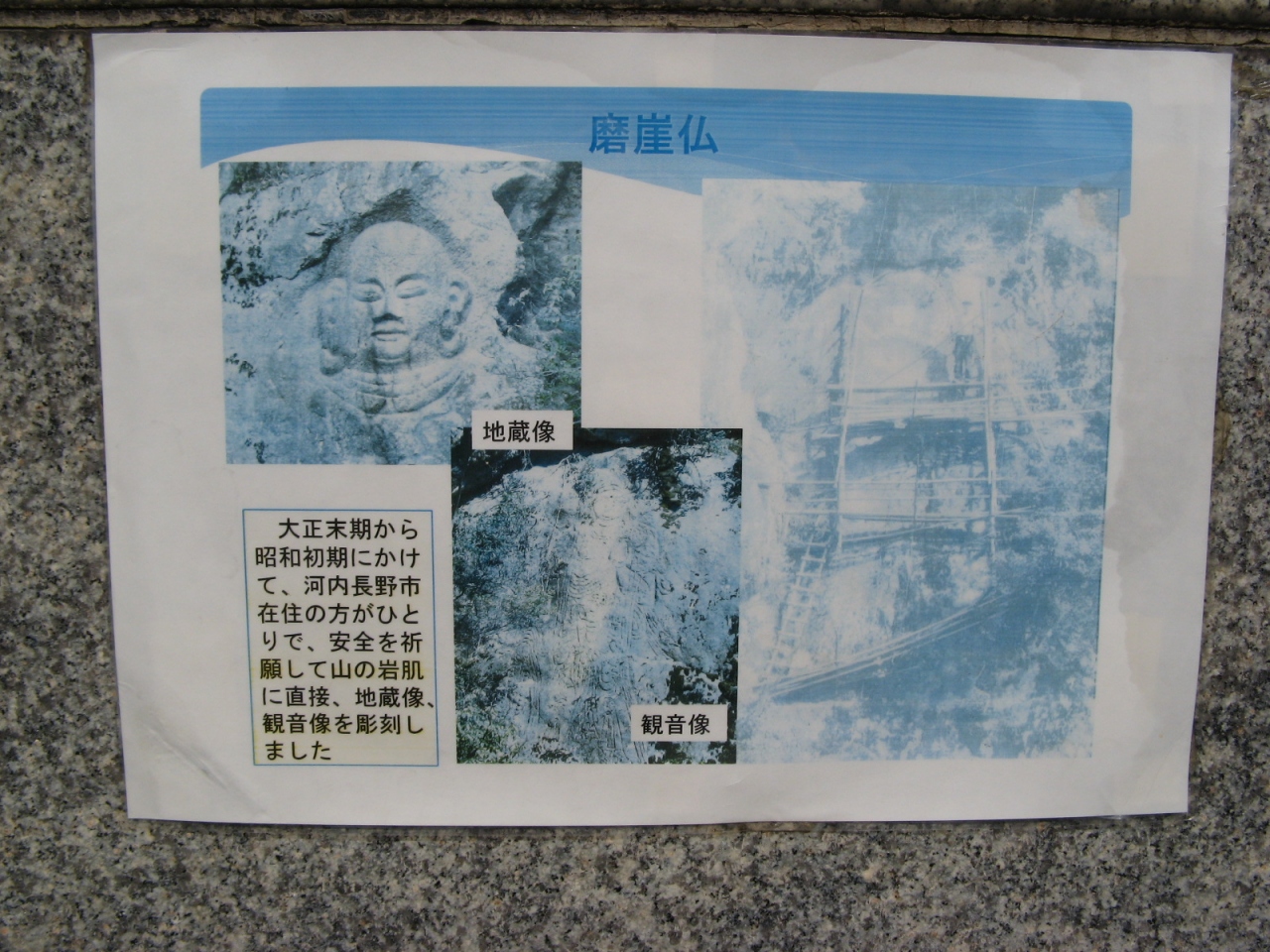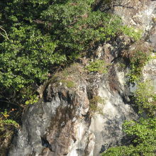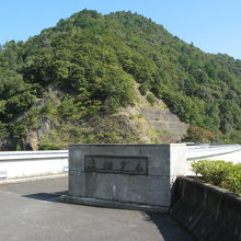 ダムのすぐ下流の右岸に磨崖仏が見えます。ダムの上から見ると、左側に地蔵菩薩、右側に観音菩薩像が見えますが、よく見ないとわかりにくいので、現地にある説明板を頼りに見られると良いでしょう。