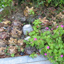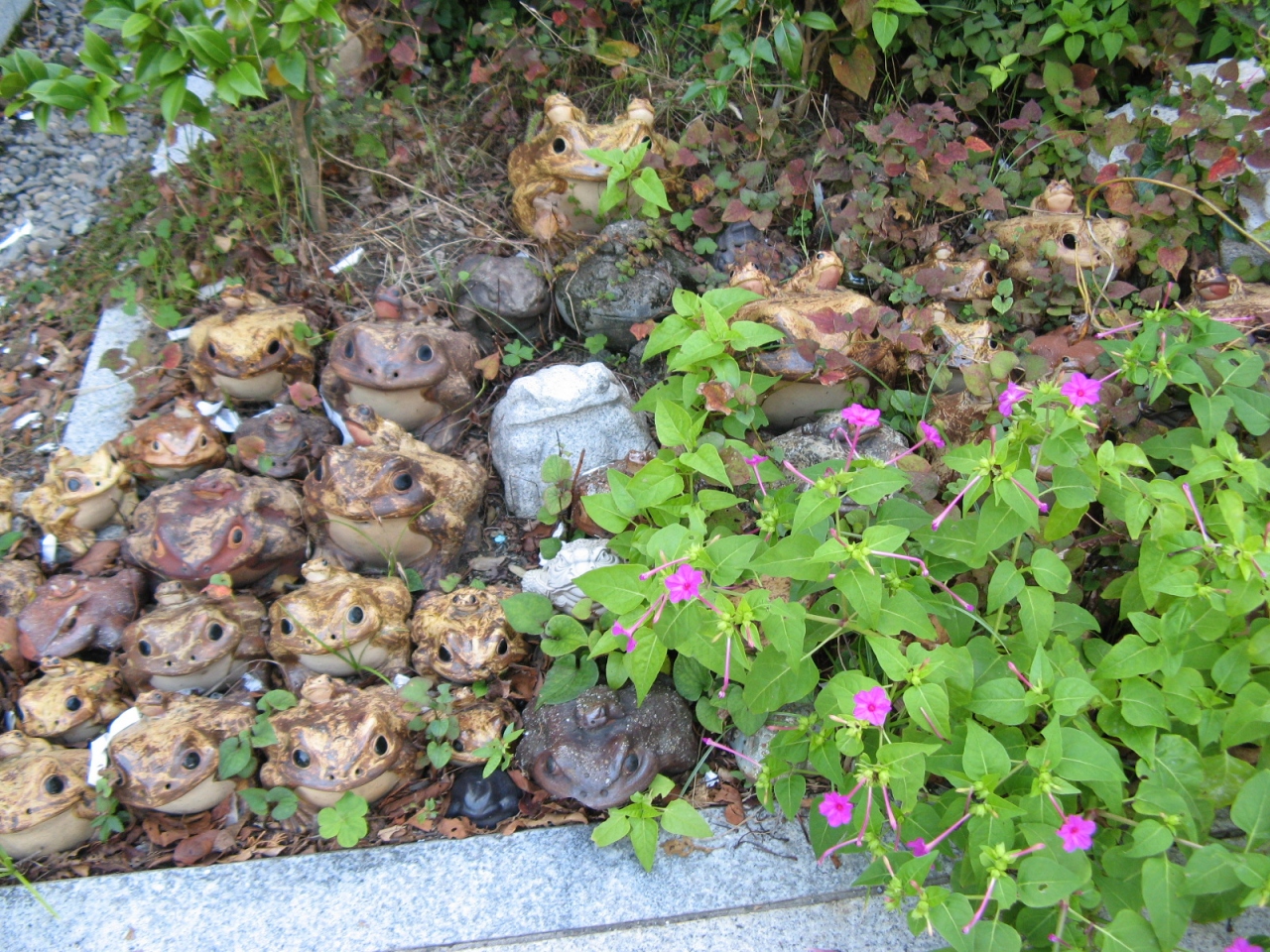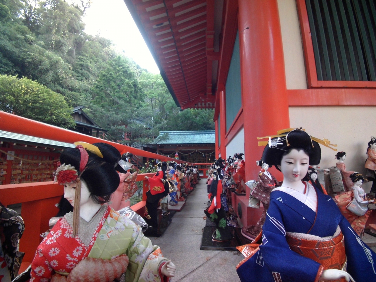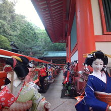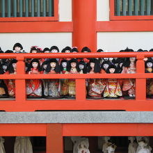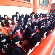 女性の病気回復や安産・子授けなどにご利益があるそうで、拝殿には参拝した方が奉納したらしい市松人形や木目込人形などががたくさん並んでいます。一体一体のお顔を見ていると可愛らしいのですが、全体を眺めると少し不気味な感じがしました。境内には、カエルの置物や招き猫など人形以外の置物を並べた場所や針塚などもありました。