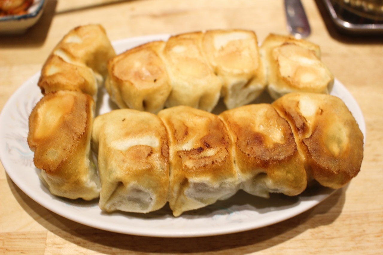 焼き餃子、キムチ、瓶ビールを頼みます。