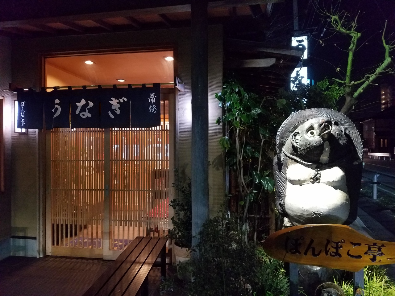 ふっくら焼きあげたうなぎはとっても美味。うなぎ以外のメニューも豊富です。ぽんぽこ亭という店名の通り、入り口ではタヌキの置物が迎えてくれます。