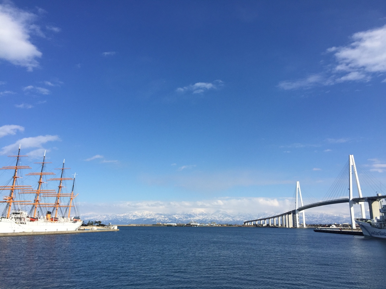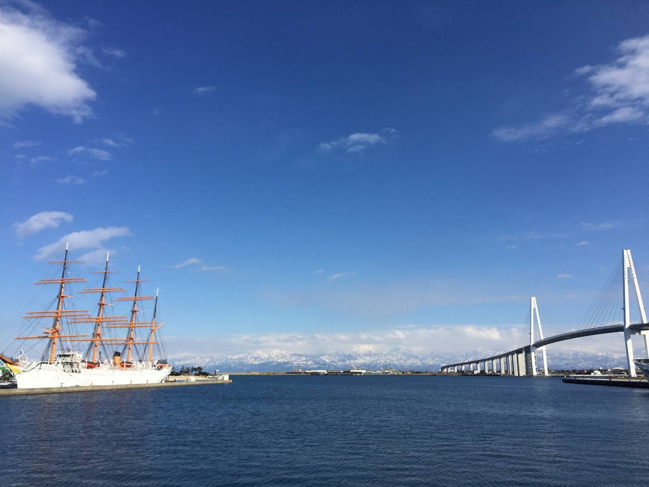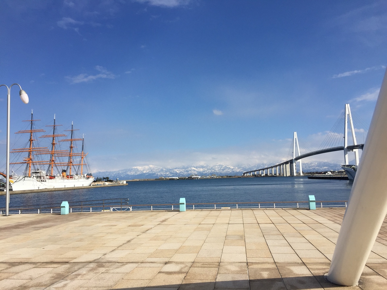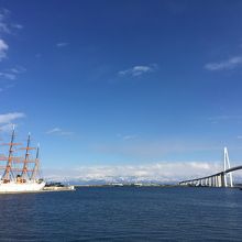 海王丸と新湊大橋と立山連峰と青空の景色は とても素晴らしく ぼーっと眺めていた。
