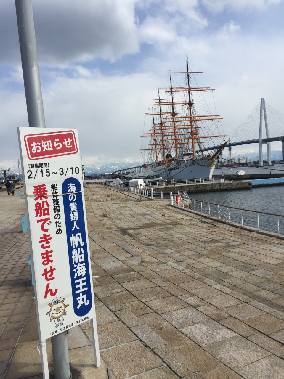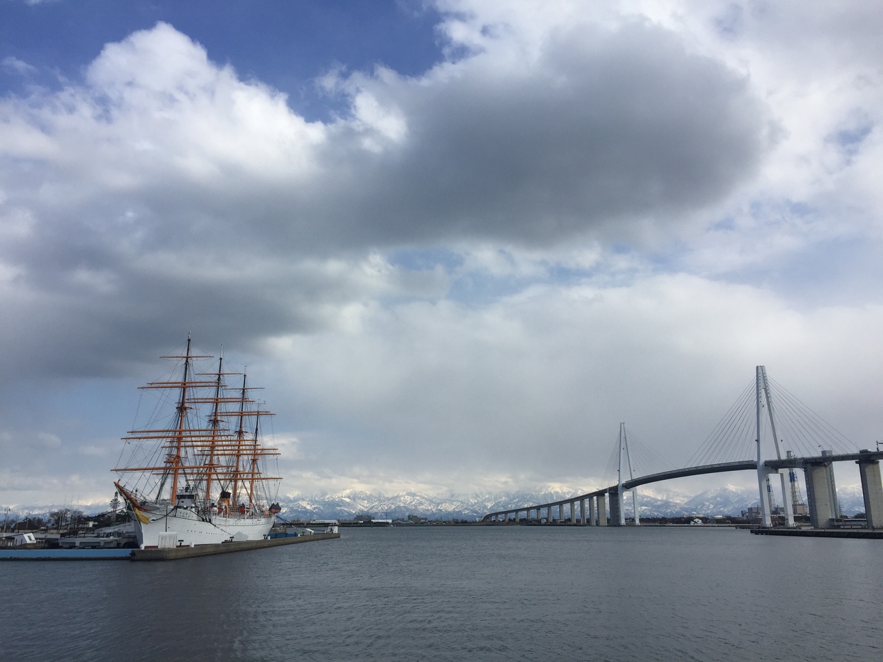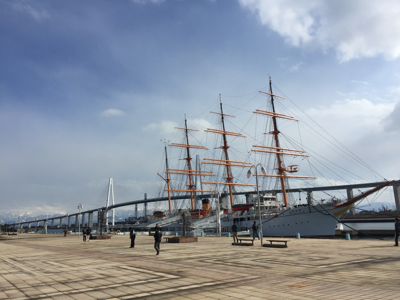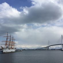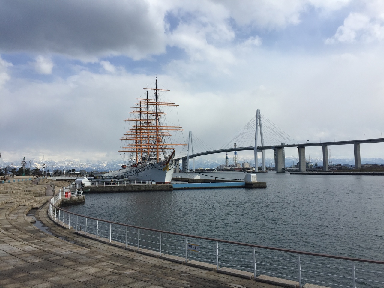 海王丸と新湊大橋と立山連峰と青空の景色は とても素晴らしく ぼーっと眺めていた。