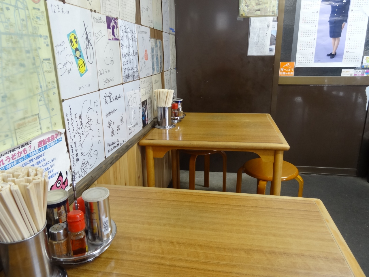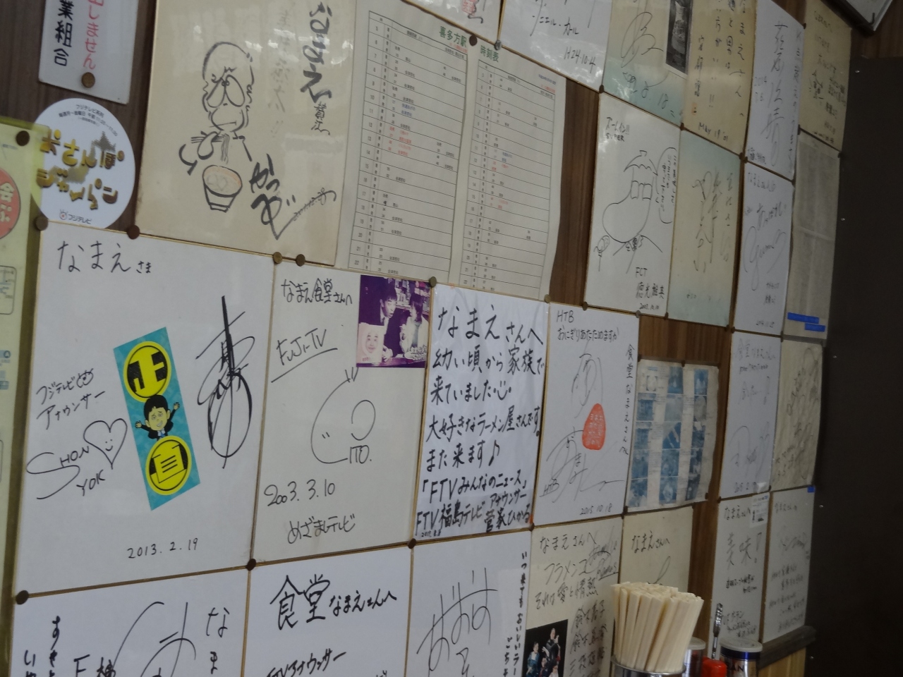 以前から気になっていた喜多方ラーメン店です。初めてお店まで車で行った時は、お昼前なのに大行列で、入店は遠慮しました。次に行く時までに開店時間や周囲の駐車場の情報を調べておき、今回やっと入店できました。店内の板壁にはテレビ局や芸能人の色紙や写真が飾ってあり、さすが喜多方ラーメン老舗、指折りのお店だと納得。