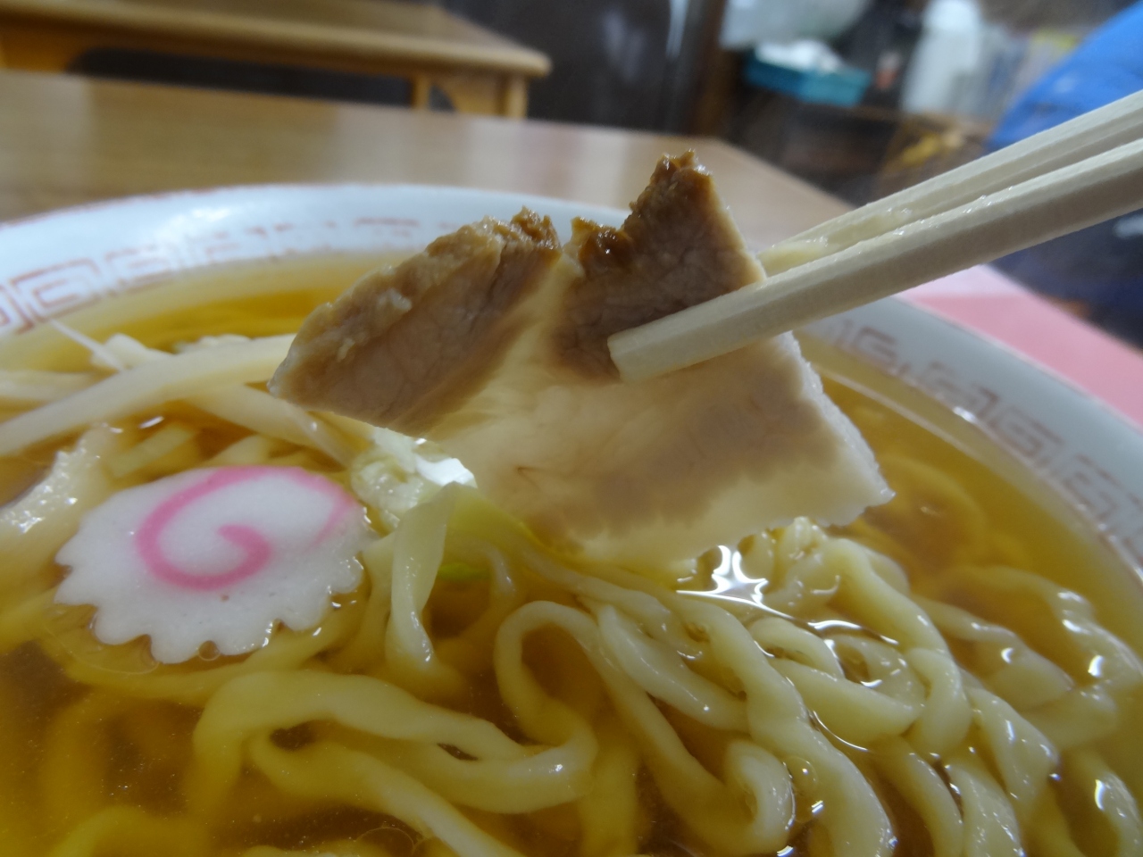 5・6人用のテーブルと2・3人用のテーブルの計3つだけ。メニューはラーメンだけでなく親子丼やうどんなどもあります。注文したのは極太手打ちラーメン。極太手打ちという名前が付いているだけあって、麺は太めでちぢれ麺、醤油だしのスープにとてもマッチしていました。具はチャーシューが二枚、なるとが一枚、メンマ数本、刻みネギ。至ってシンプル。麺が薄く見えるスープに微妙に絡まって、素晴らしい味となっています。これで570円は安い!また、ラーメン食べに来ますよ。