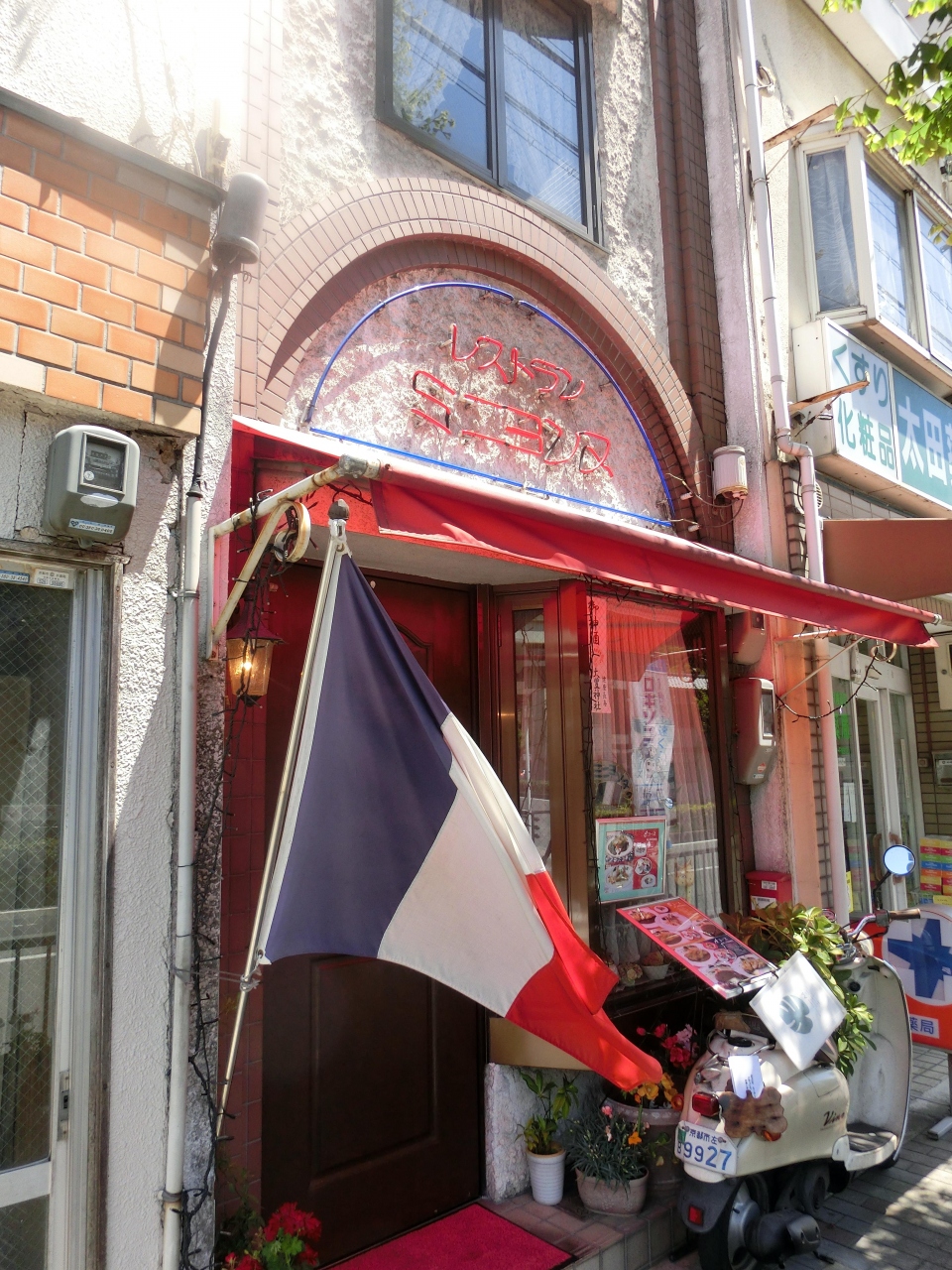 真如堂を参拝後、白川通に戻り昼食にします。付近に食事処は3軒(肉、イタリアン)しかなくフランス国旗が店頭にたなびくレストランを選びました。ドアを開けるとうなぎの寝床のような店内でお客は誰もおらず不思議な雰囲気です。ランチAは1,150円でスープ、サラダ、メイン、パン又はライス、コーヒー・紅茶でメインはハンバーグ、豚、チキンから選べますが豚にしました。店を構えて39年という初老のマダムと世間話をしながら食事を楽しみました。紅葉の時期は真如堂の拝観客で大変忙しくなるようです。スープ、サラダはサービスランチの添え物の感じですが、メインの豚は薄肉のカツ仕立てでソース共々期待以上の美味しさでした。コーヒーも風味がありました。佐久間良子が時々訪れたようで、写真や平岳大と一緒の色紙が壁に飾られていました。真如堂参拝の際の昼食にお薦めです。