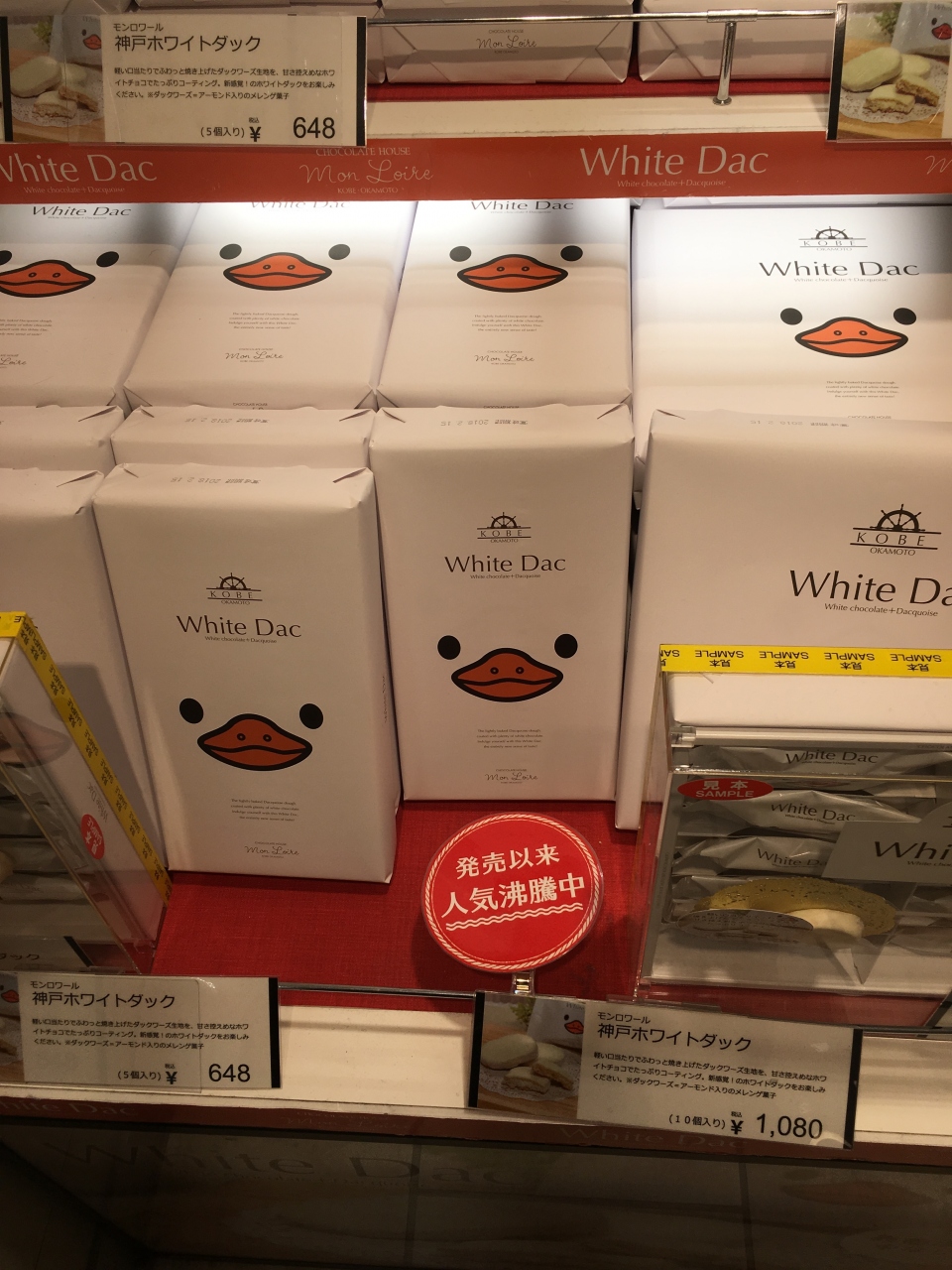 三宮のセンタービルにあるお店です。ここにはおみやげに最適なお菓子もたくさんあって、神戸ホワイトダックというそこそこの軽さで量もあるし、お菓子のパッケージもかわいいし、値段も安い。しかも、おみやげにしてはかなり美味しいのです。