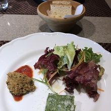 ラザーニェタイプのパスタにクリームを包み込んだ料理や魚(たら)のバジル衣のフライとサラダになっていました。