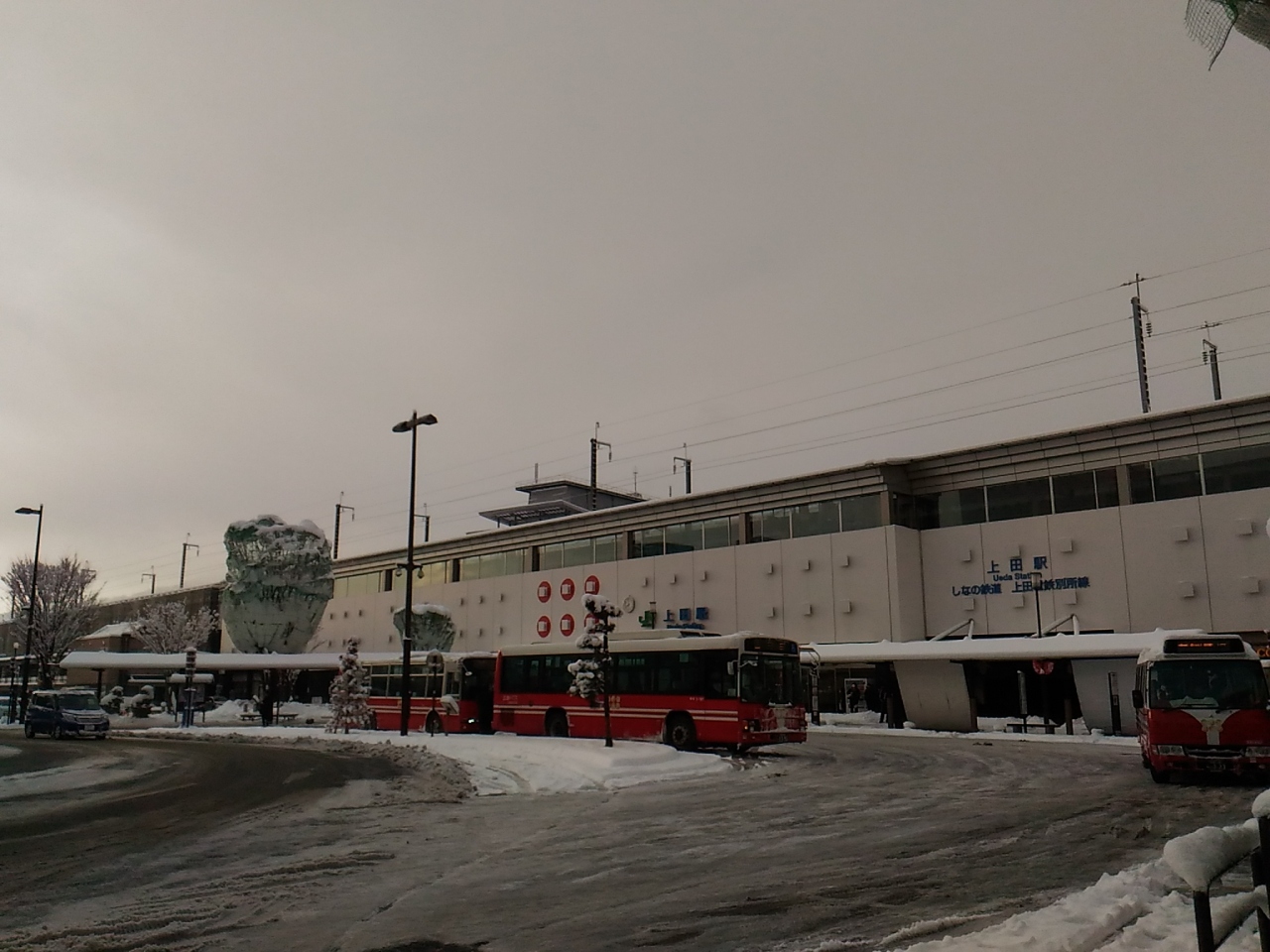 JR上田駅のお城口目の前にあるバスロータリーに乗り場があります。本日は大雪警報が出ていてどこもかしこも白銀の世界、なので上田バスの赤い車体が良く映えます。恐らく、真田の赤い甲冑を意識しての深紅の赤なのでは?そう考えると普通のバスもカッコ良く見えるのが不思議です、是非。