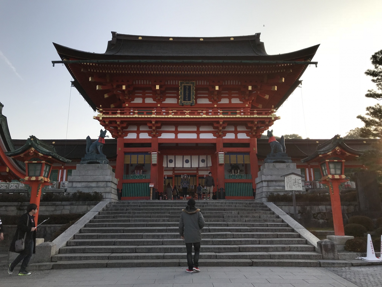 大きな鳥居をくぐると階段の上に鮮やかな朱色の美しい楼門が現れます。さすが全国三万カ所の稲荷神社の総本社の名にふさわしい堂々たる佇まいです。両脇の狐の像も印象的。朝早い時間に行ったので人は少なかったのですが、残念ながら逆光で日に映える綺麗な写真は撮れませんでした。