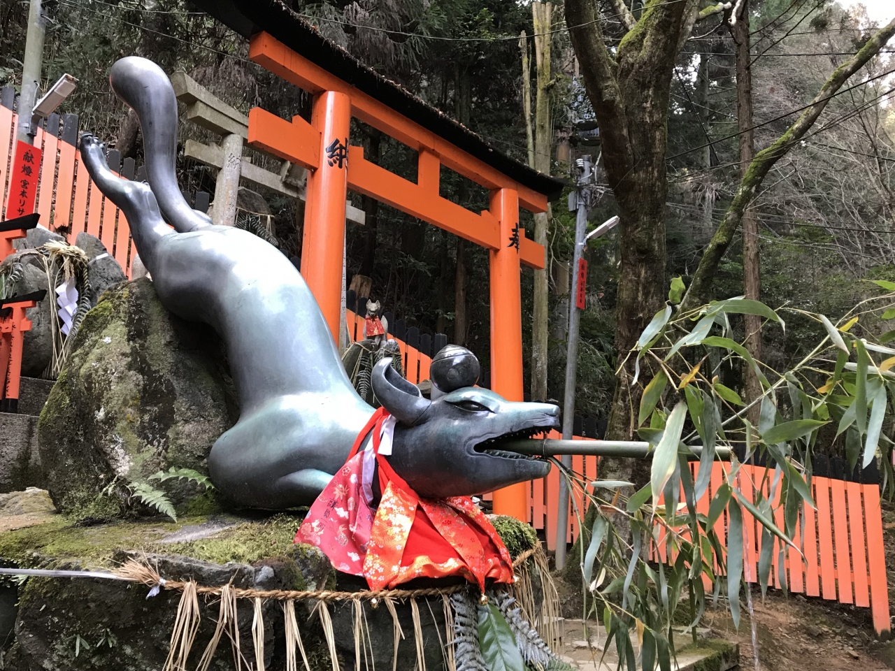 楼門や鳥居の両脇はじめ境内のあちこちに狐の像があります。みな朱色の前掛けをして何かをくわえています。稲を食い荒らすネズミの天敵だったことから、また色や尻尾の形が稲を連想させることから、稲の神様のお使いとされるようになったそうです。水場にはユニークな狐もいました。探してみてください。