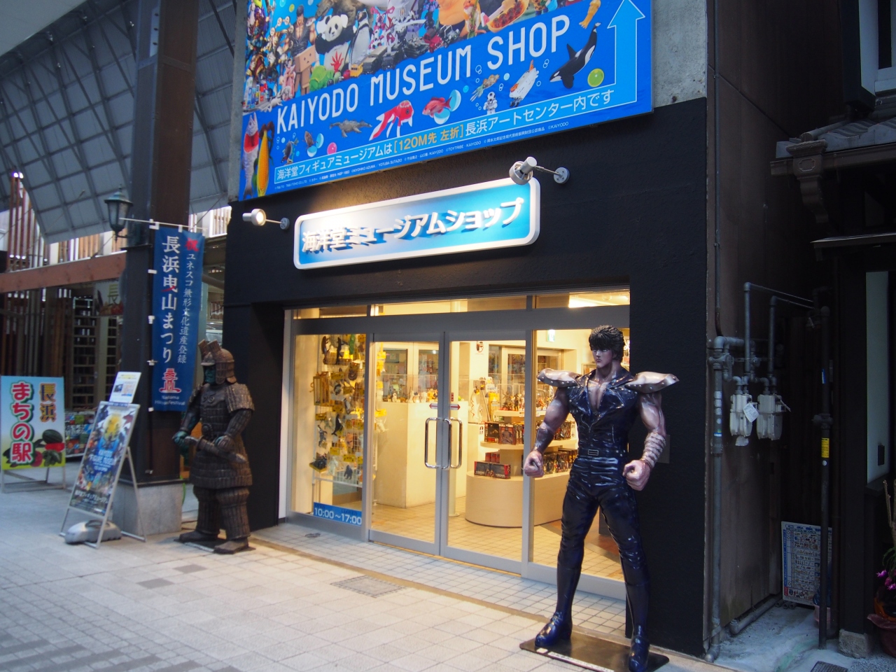 長浜の観光スポットの黒壁スクウェアにフィギアミュージアムはあります。入口には北斗の拳のフィギアがあります。まわりの歴史を感じる街並みからは、とても違和感もありますが、このようなミュージアムショップも子供などには人気なのでしょう。1階はミュージアムショップとしていろいろなフィギアが売られており、見て歩くのも楽しいです。