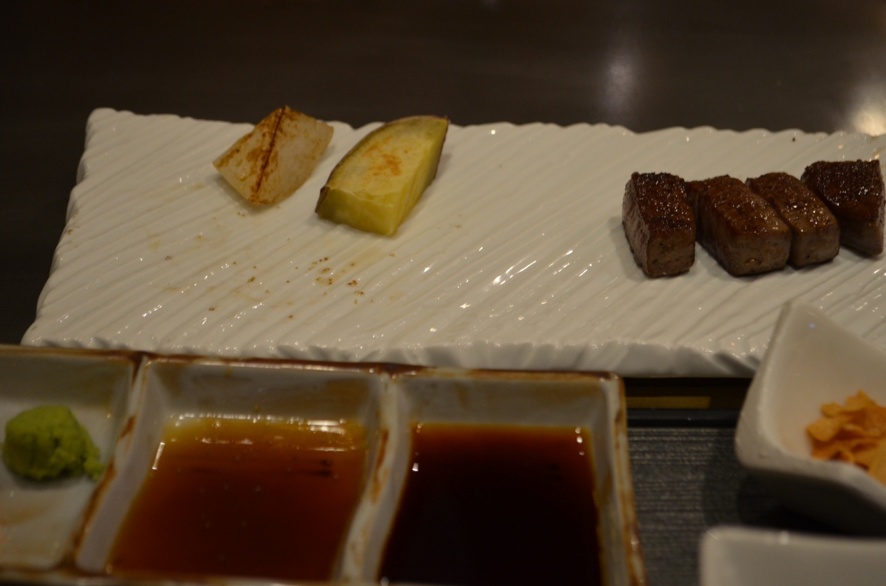 千里中央駅から少し離れていて、歩いて五分ちょっと、千里阪急ホテルの二階にあります。大阪万博の年に開業したということで、今年で四十八年目です。ぴかぴかに磨き上げられた鉄板には、風格も感じられます。お昼をコースでいただきましたが、量は少なめで焼き方は職人技でした。脂身の多いお肉は、焼き加減も絶妙で甘みがありました。