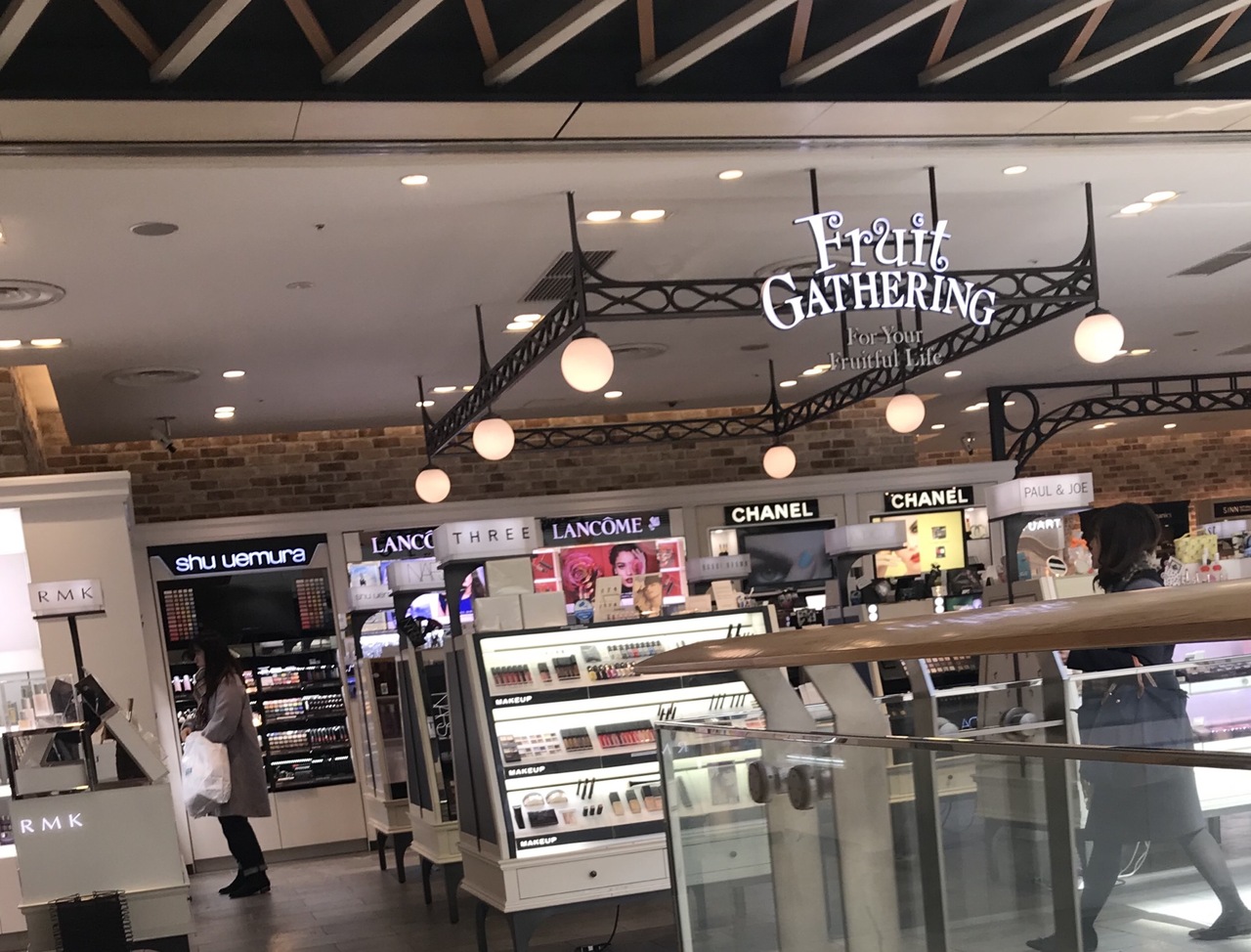 化粧品ブティックがいろいろ集まっている楽しいエリアです。空港の免税店のようでテンションが上がります。百貨店だとなかなか自分で自由に試すことができないので、こういうショップはとてもありがたいと思いました。