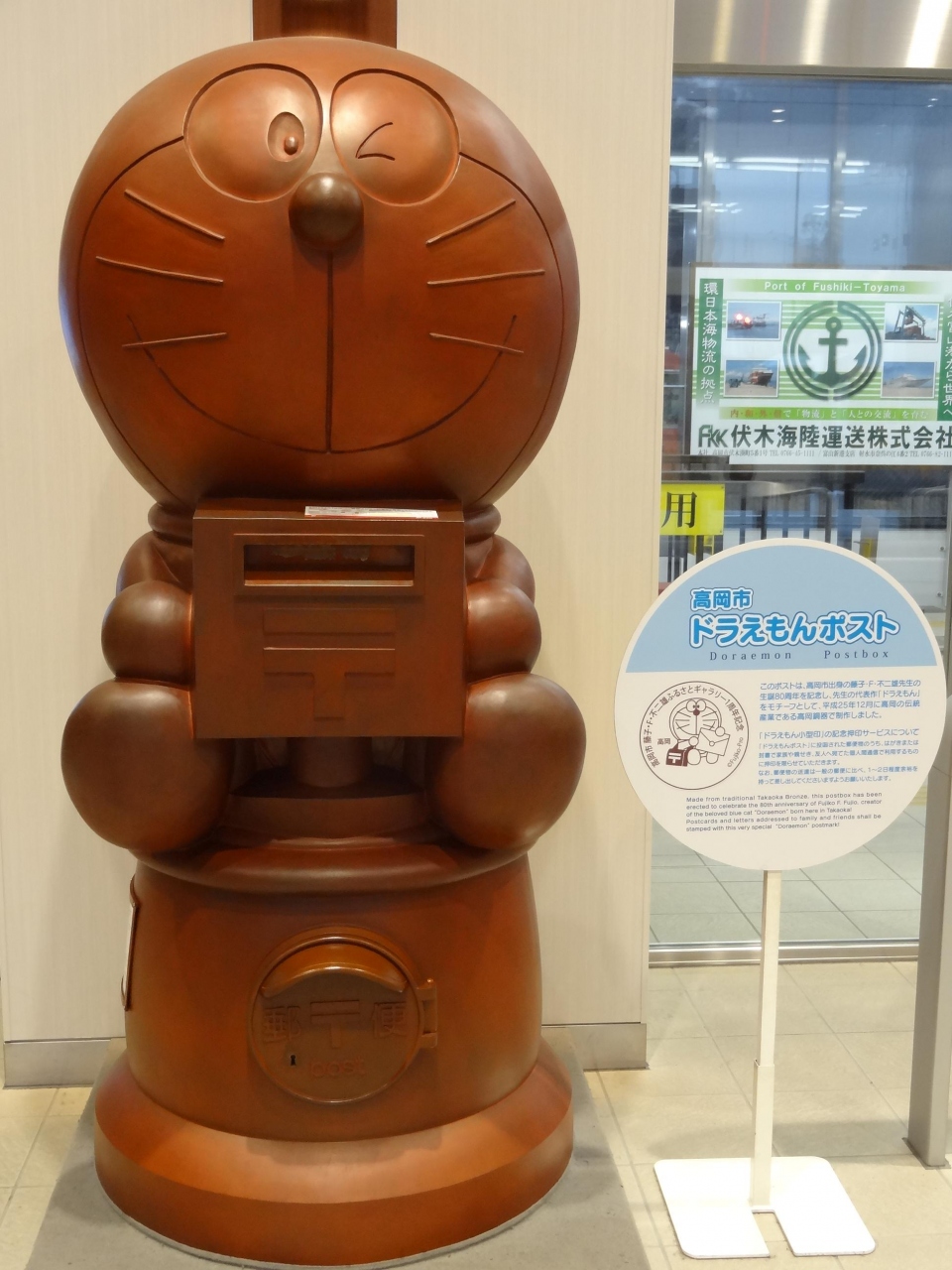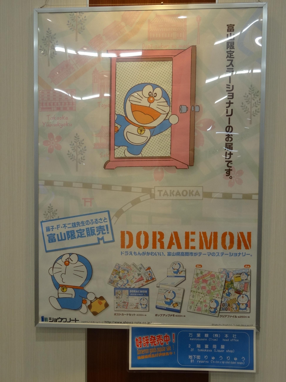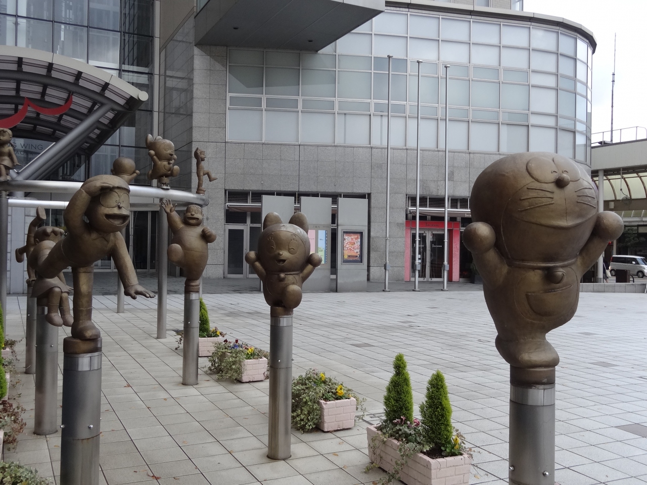 ドラえもんの作者である、藤子・F・不二雄氏の生誕地高岡市の、駅前広場のビル側にあります。最近になって、ここの広場に持ってきたと記念碑に書かれています。ドラえもんだけでなく、ノビタ、ジャイアン、スネオ、しずかちゃん、ドラミちゃんなど、ドラえもんのキャラクターが勢ぞろいしています。下からみてもいいし、エスカレーターで上って上から見下ろすのもいいですよ。小さなお子様連れだと大喜び、間違いないでしょう。